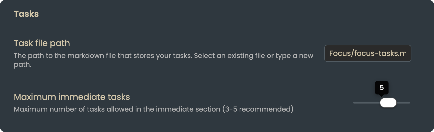 | Task file path | Where Focus stores your tasks | focus-tasks.md |
