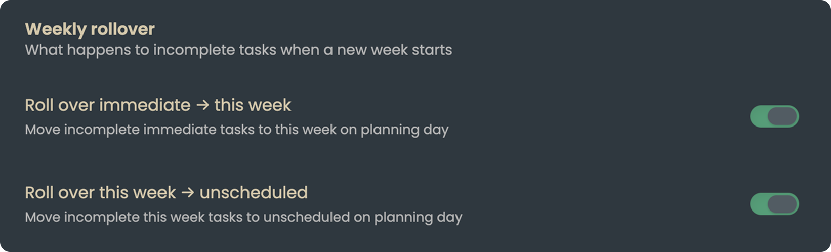 | Rollover behavior | What happens to incomplete tasks | Immediate → This Week → Backlog |