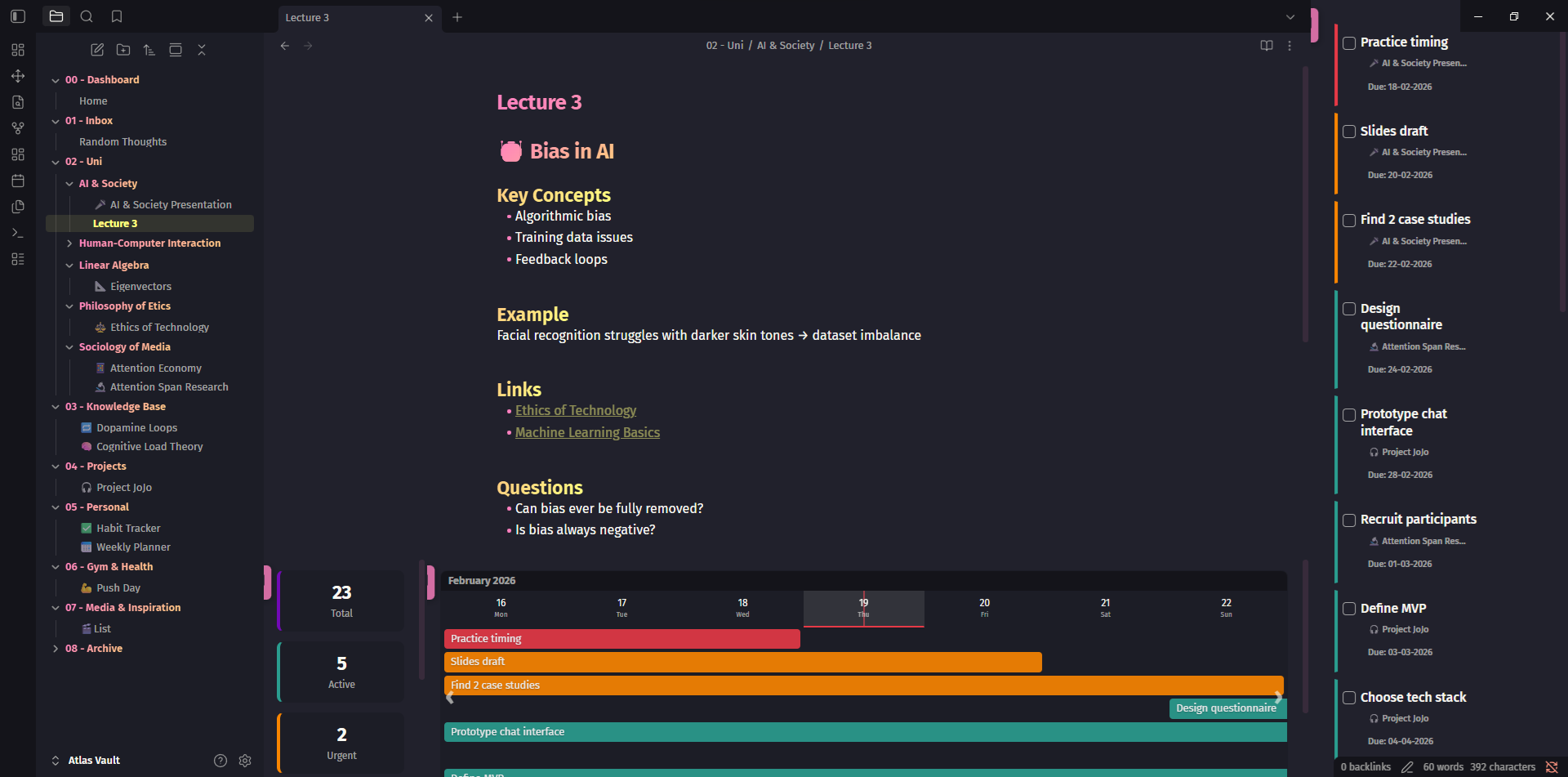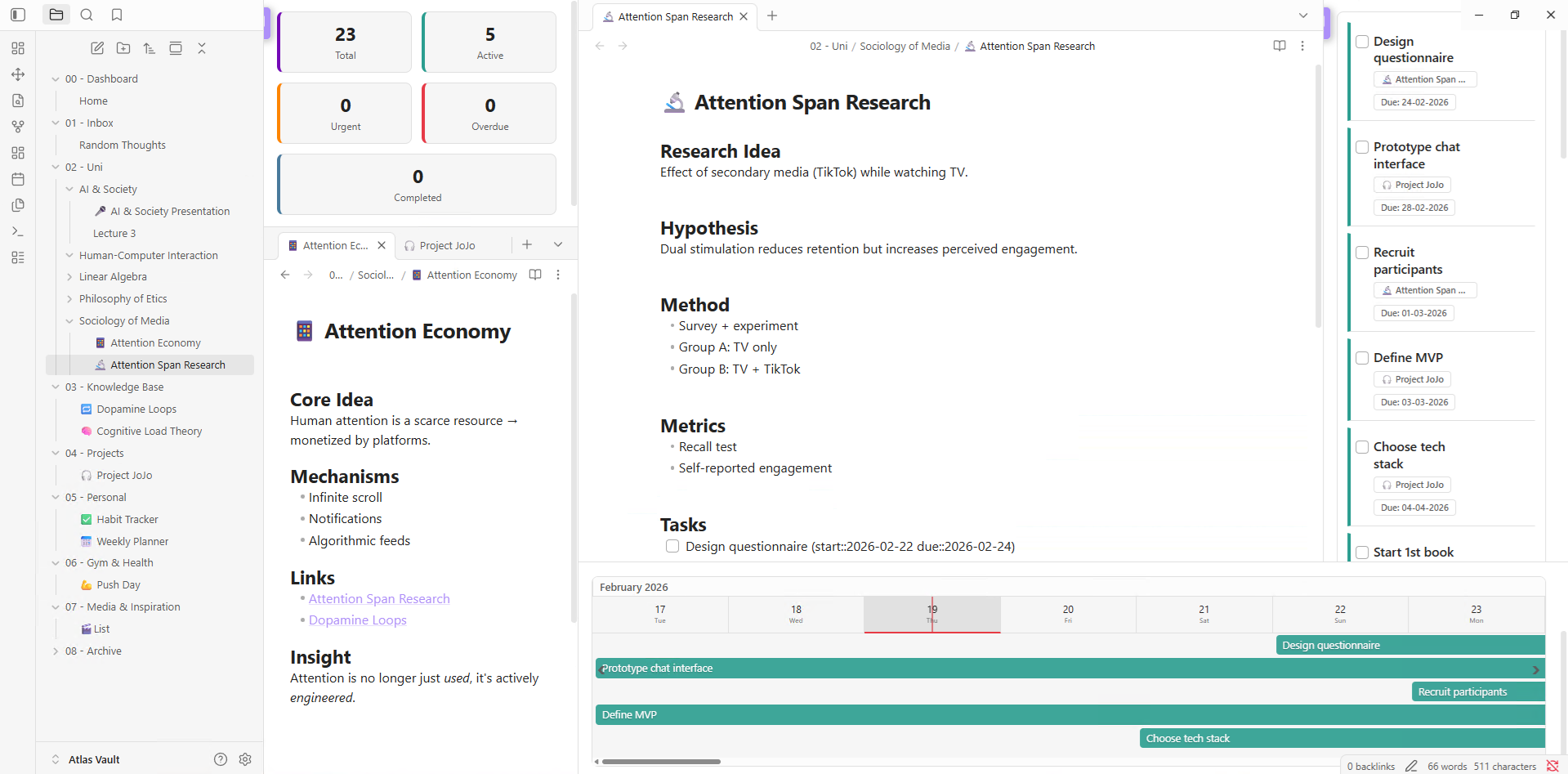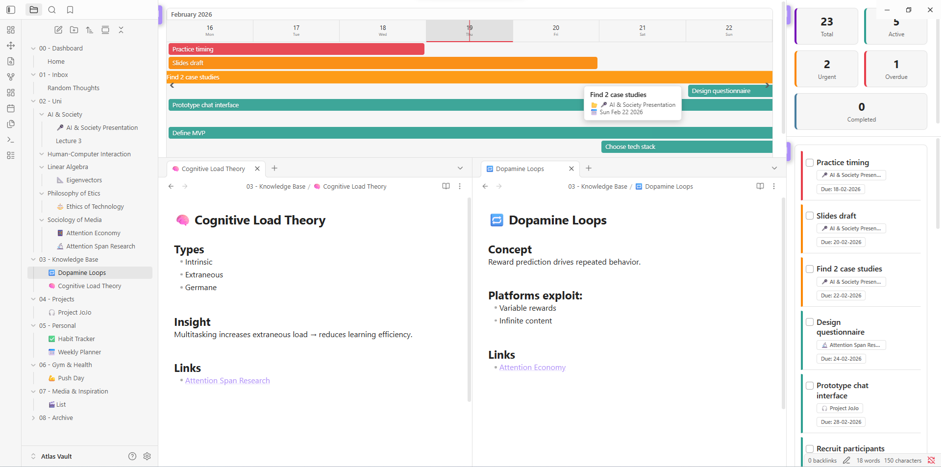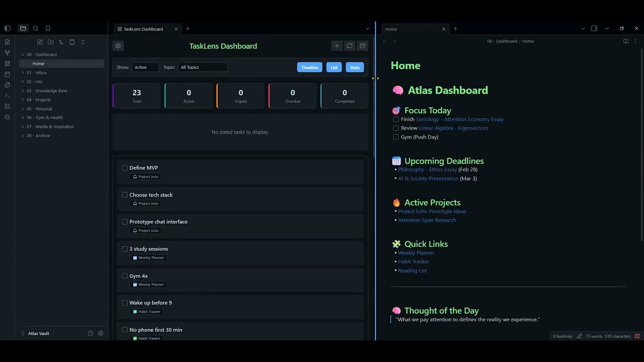 - Open Dashboard: Spawns the main widgets (splits intelligently so it doesn't overwrite your active note)
