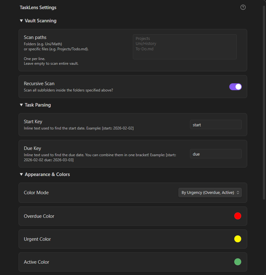 TaskLens uses standard markdown checkboxes. It scans for inline dates, supporting both YYYY-MM-DD and DD-MM-YYYY formats. You can customize the start and due keys in the settings.