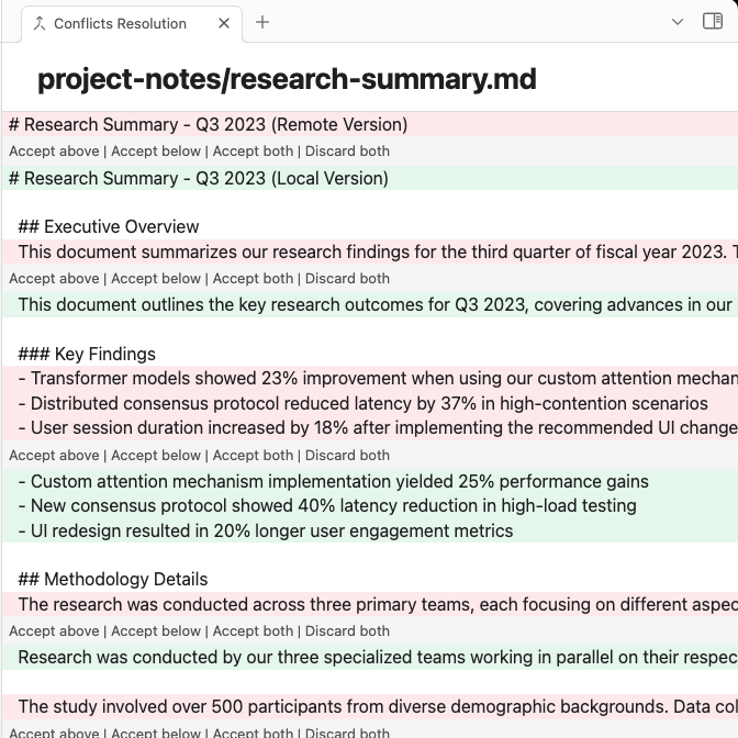When you sync multiple vaults using this plugin you might risk creating conflicts between the remote and a local vault. This usually happens when the remote has a new update from vault A, but vault B edits the file before syncing with remote. That creates a conflict, by default we'll open a view to let you resolve the conflict since you should have all the necessary information to correctly resolve it.