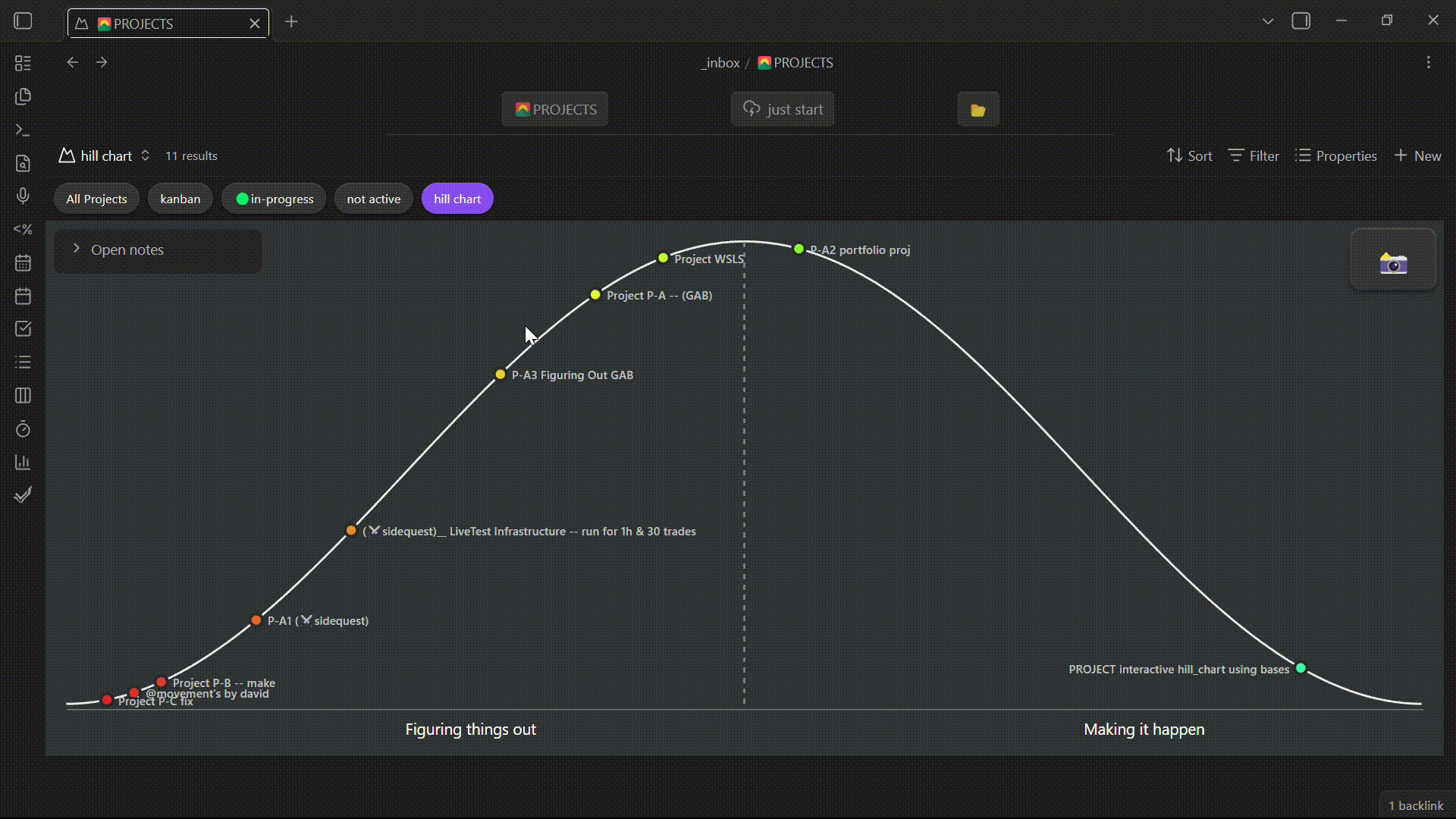 An interactive Hill Chart view for Obsidian Bases Inspired by basecamp. Visualize project progress directly from your Base using draggable dots that stay in sync with note frontmatter.
