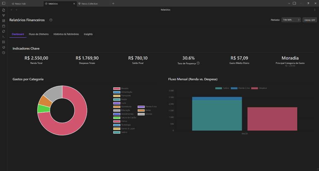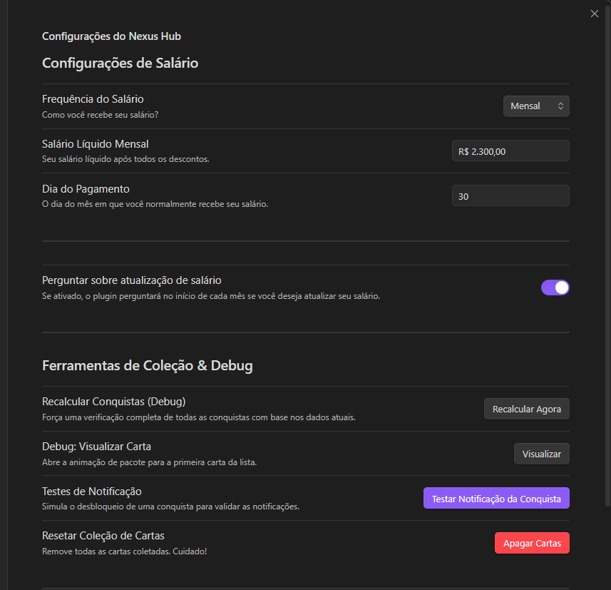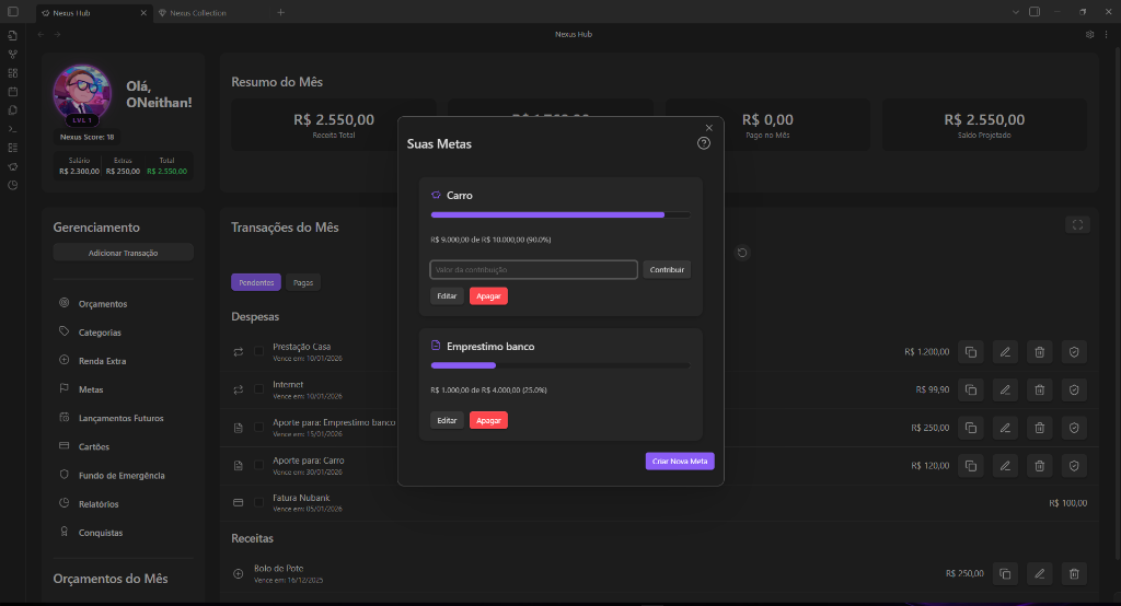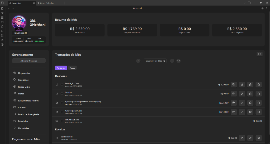 O Nexus Hub não é apenas um plugin de finanças; é um sistema completo de gestão de patrimônio gamificado. Ele transforma o ato de controlar despesas, receitas e investimentos em um RPG pessoal, onde cada centavo economizado te aproxima do próximo nível.