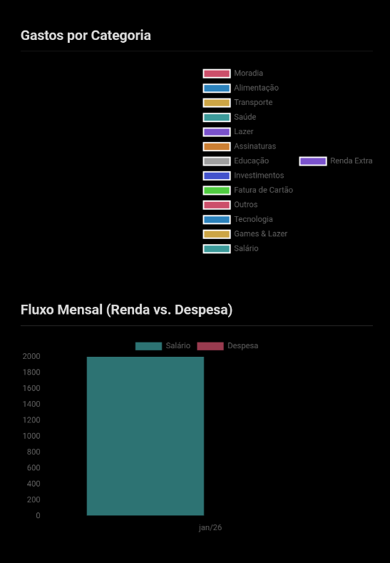 - Gráficos Dinâmicos: Fluxo de caixa mensal, distribuição por categoria e evolução patrimonial.