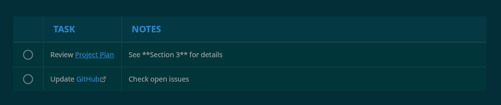 A powerful Obsidian plugin that transforms simple markdown into beautiful, interactive checklist tables with customizable columns, progress tracking, and multiple task states.