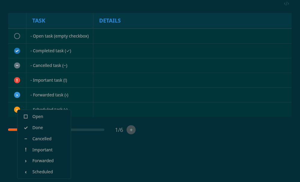 [ ]- Open task (empty checkbox)[x]- Completed task (✓)[-]- Cancelled task (−)[!]- Important task (!)[>]- Forwarded task (›)[<]- Scheduled task (‹)