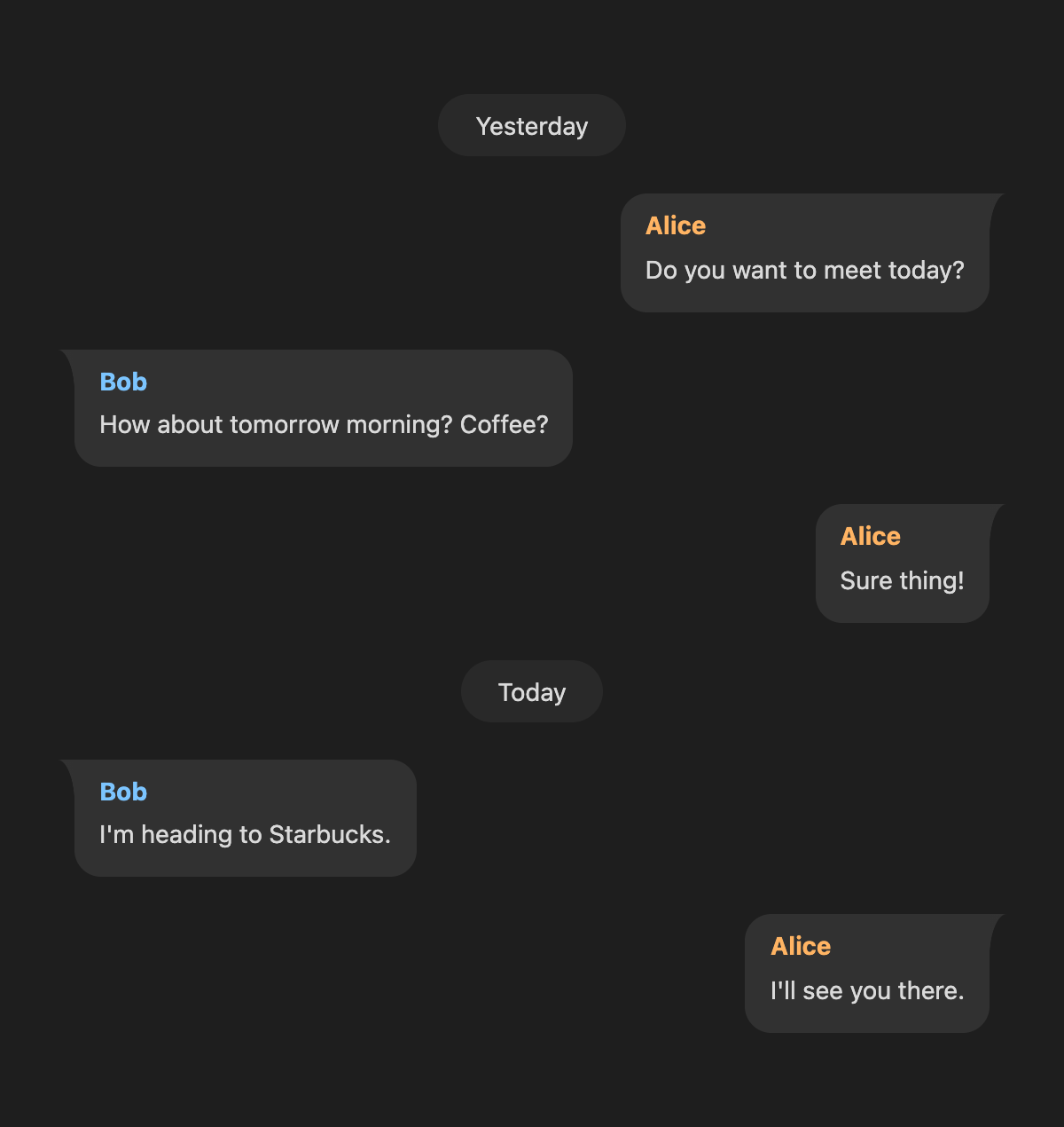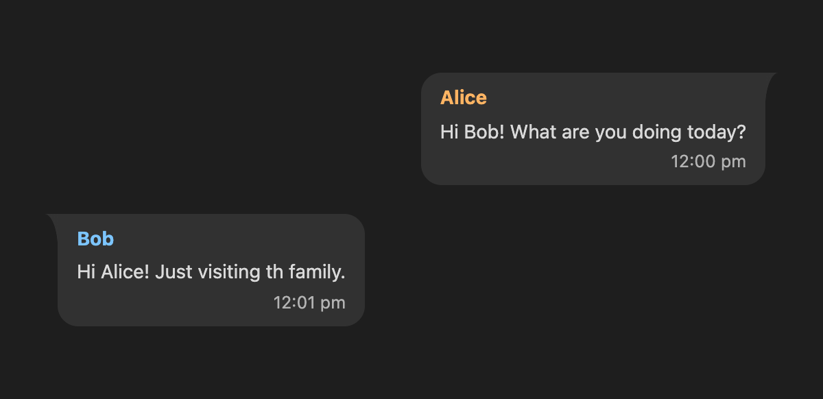 Alice | 12:00 pm > Hi Bob! What are you doing today?
