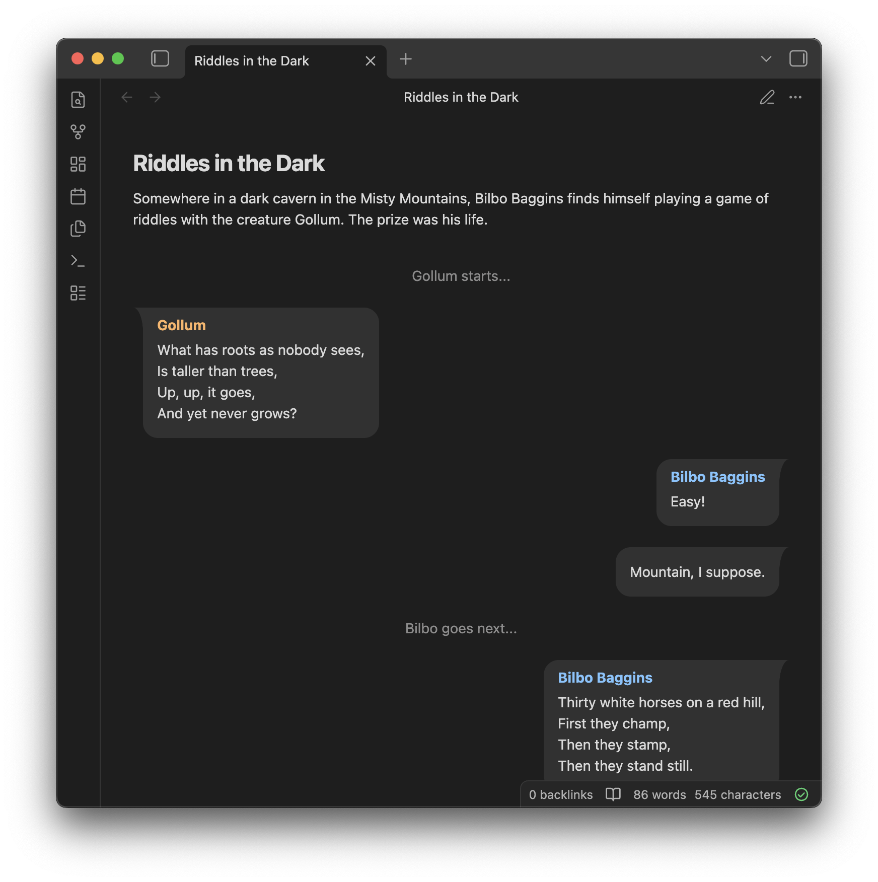 Chatterbox is an Obsidian plugin for rendering dialogues and conversations in the style of messaging apps.