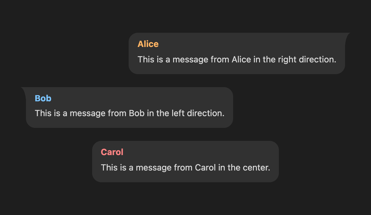 The message direction is specified using either > for right, < for left, or ^ for center.