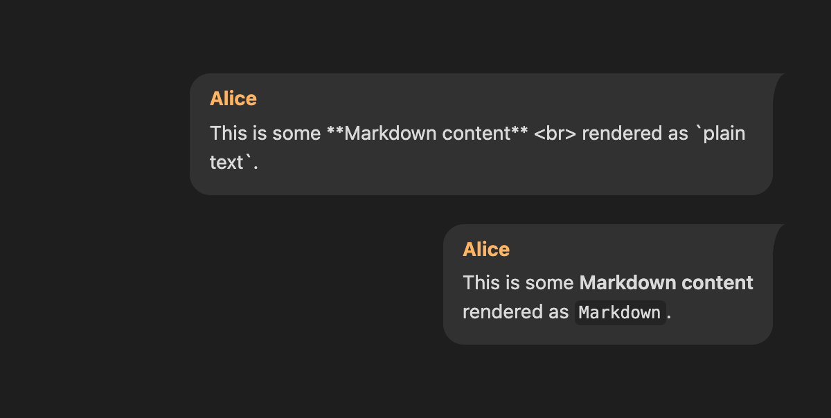 Alice > This is some **Markdown content** <br> rendered as `plain text`.