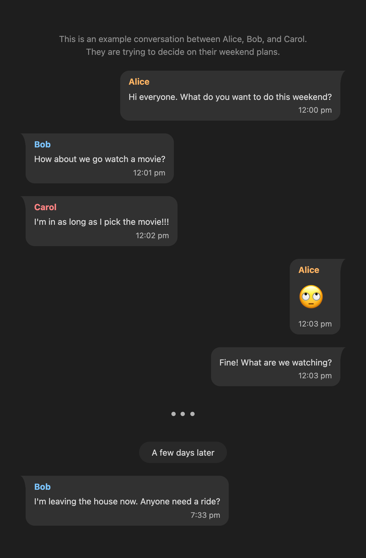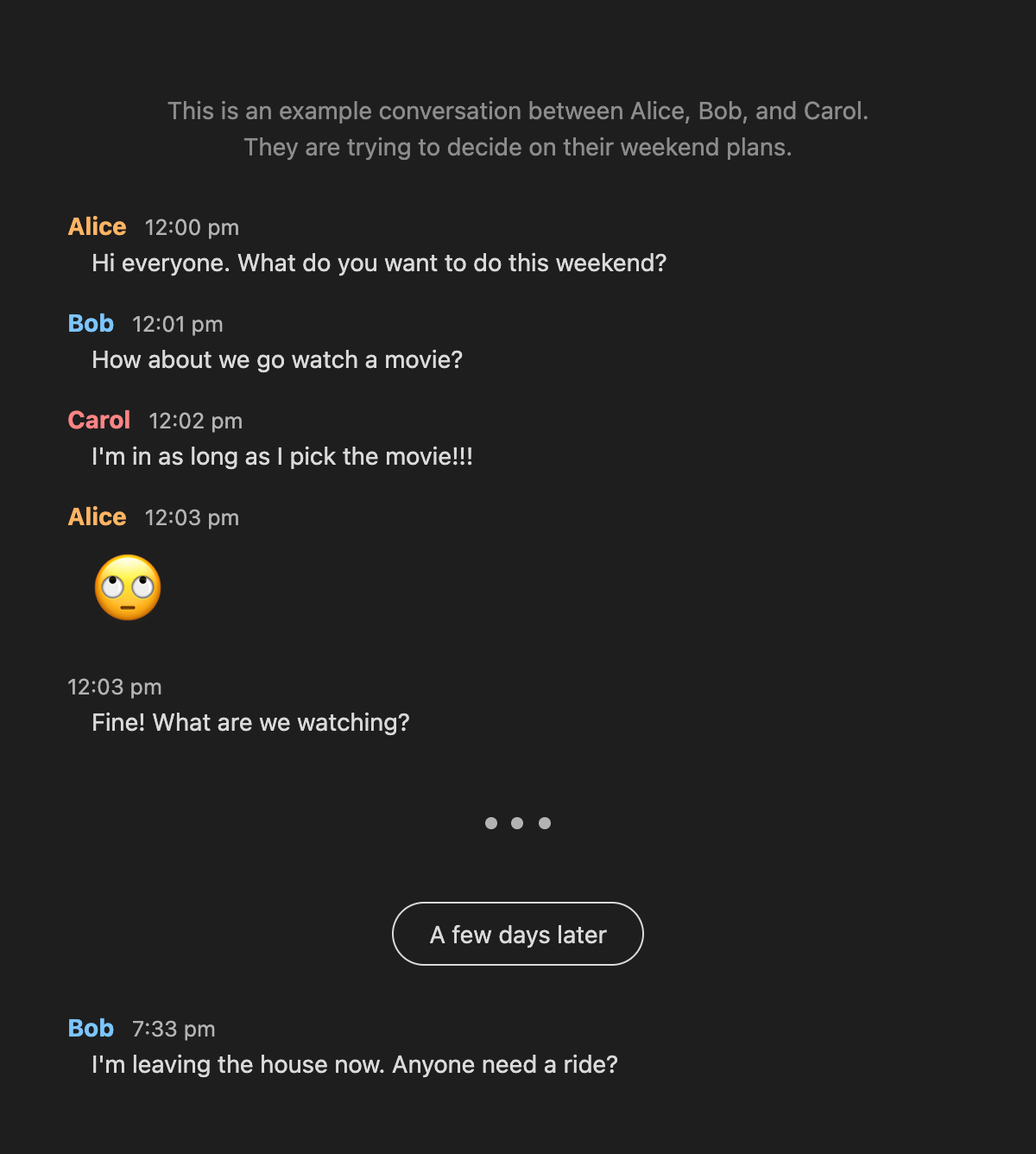# This is an example conversation between Alice, Bob, and Carol. They are trying to decide on their weekend plans.