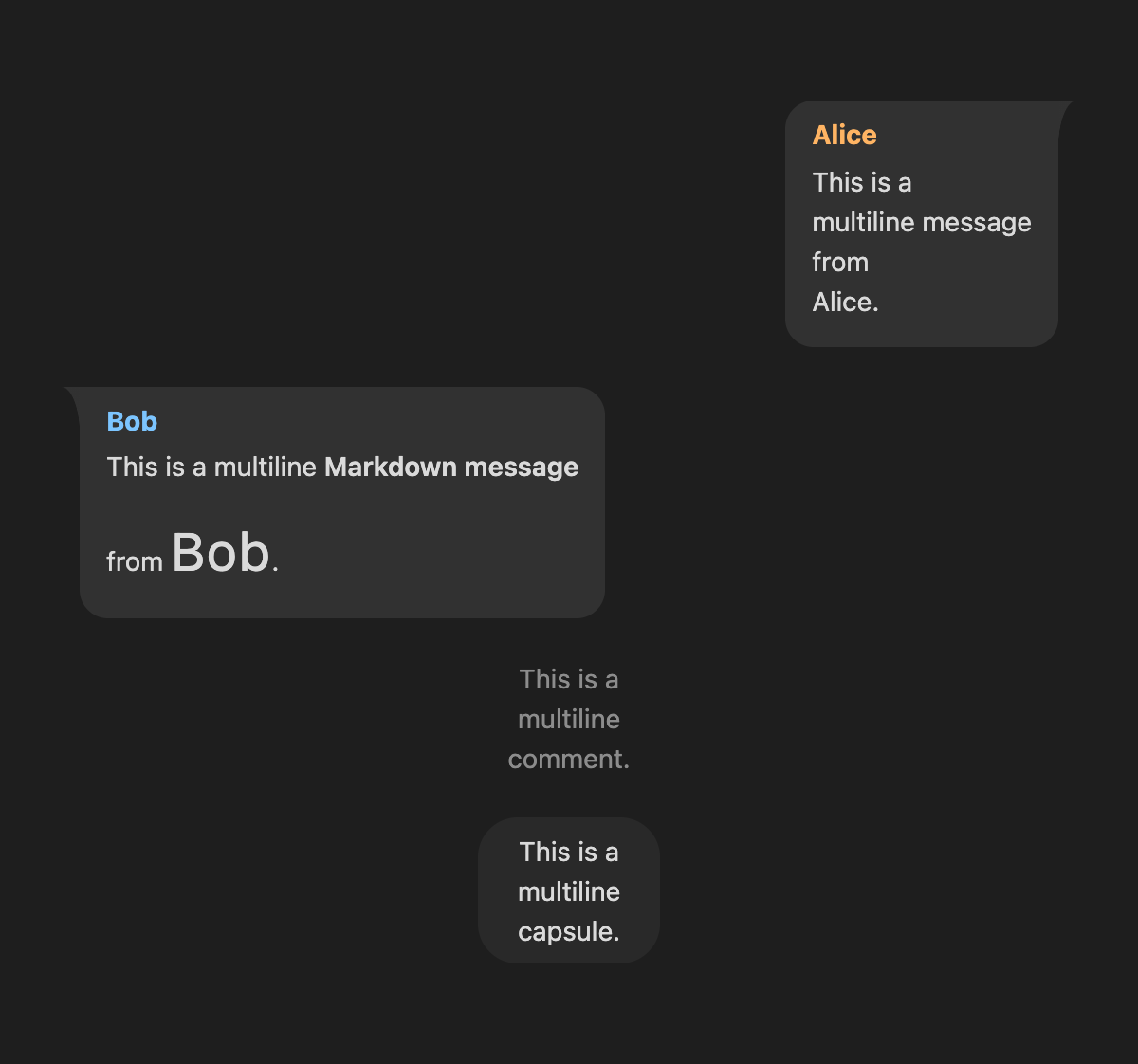 Message, comment, and capsule entries can also be written as multi-line blocks by repeating their respective entry markers three or more times to start the block, and using the same number of markers excluding any modifiers on a separate line with no other content to close it.
