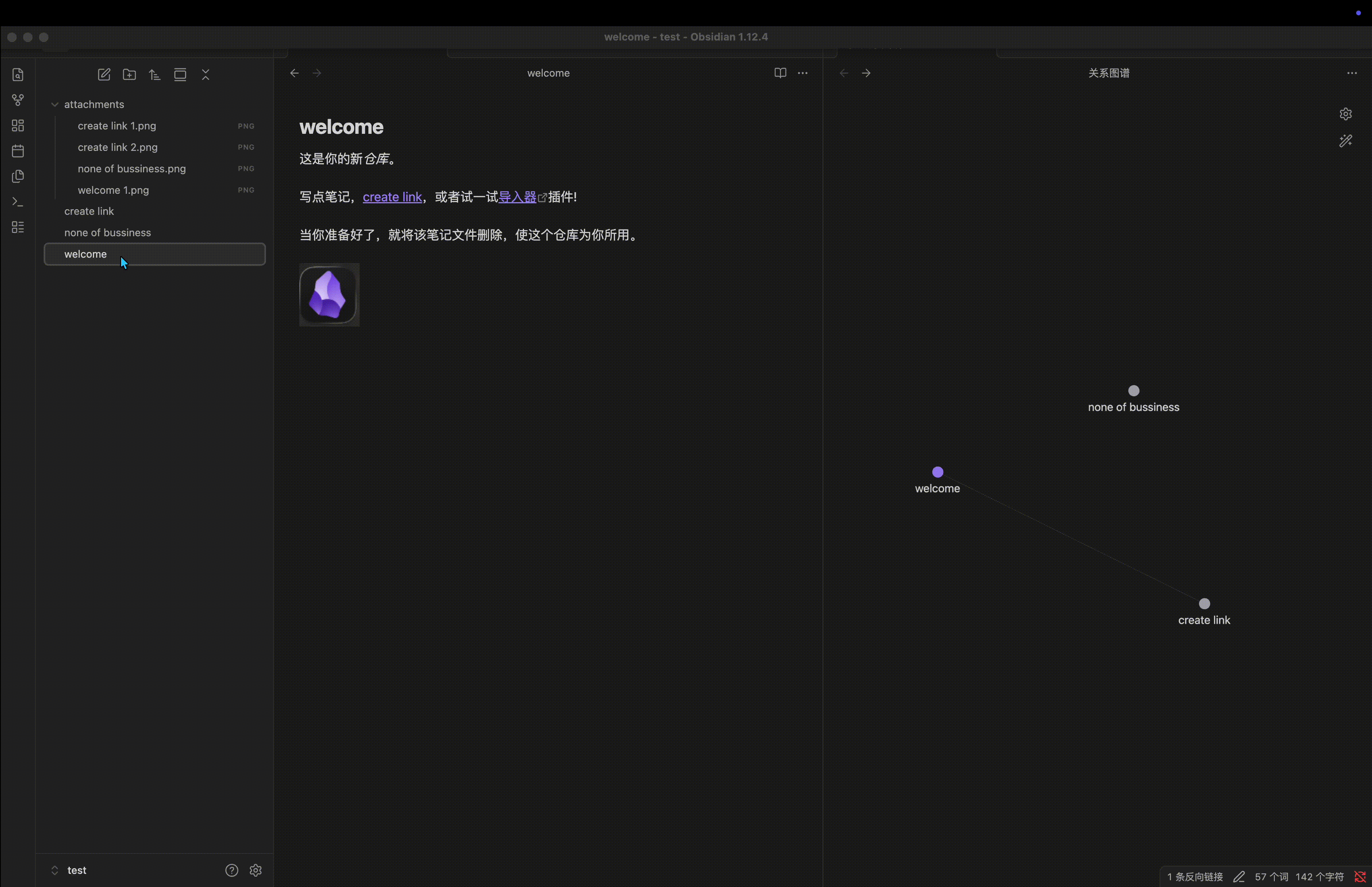 welcome.mdlinks tocreate link.mdwelcome.mdalso embedsattachments/welcome 1.pngcreate link.mdembedsattachments/create link 1.pngandattachments/create link 2.pngnone of bussiness.mdonly usesattachments/none of bussiness.pngand is not linked from the other notes