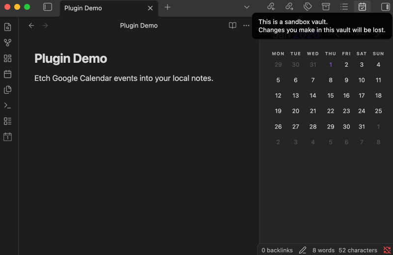 I haven't created an Obsidian plugin since obsidian-overdue, and wanted to try my hand at automating the "etching" of Google Calender events into my Obsidian notes.