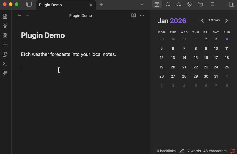 An Obsidian plugin that etches daily weather forecasts into your notes for permanent, local, offline access.