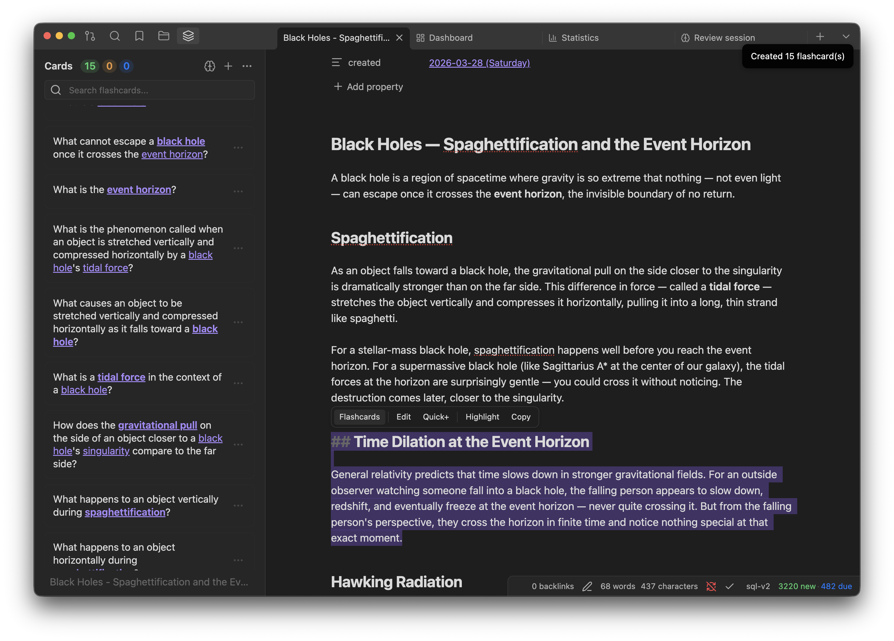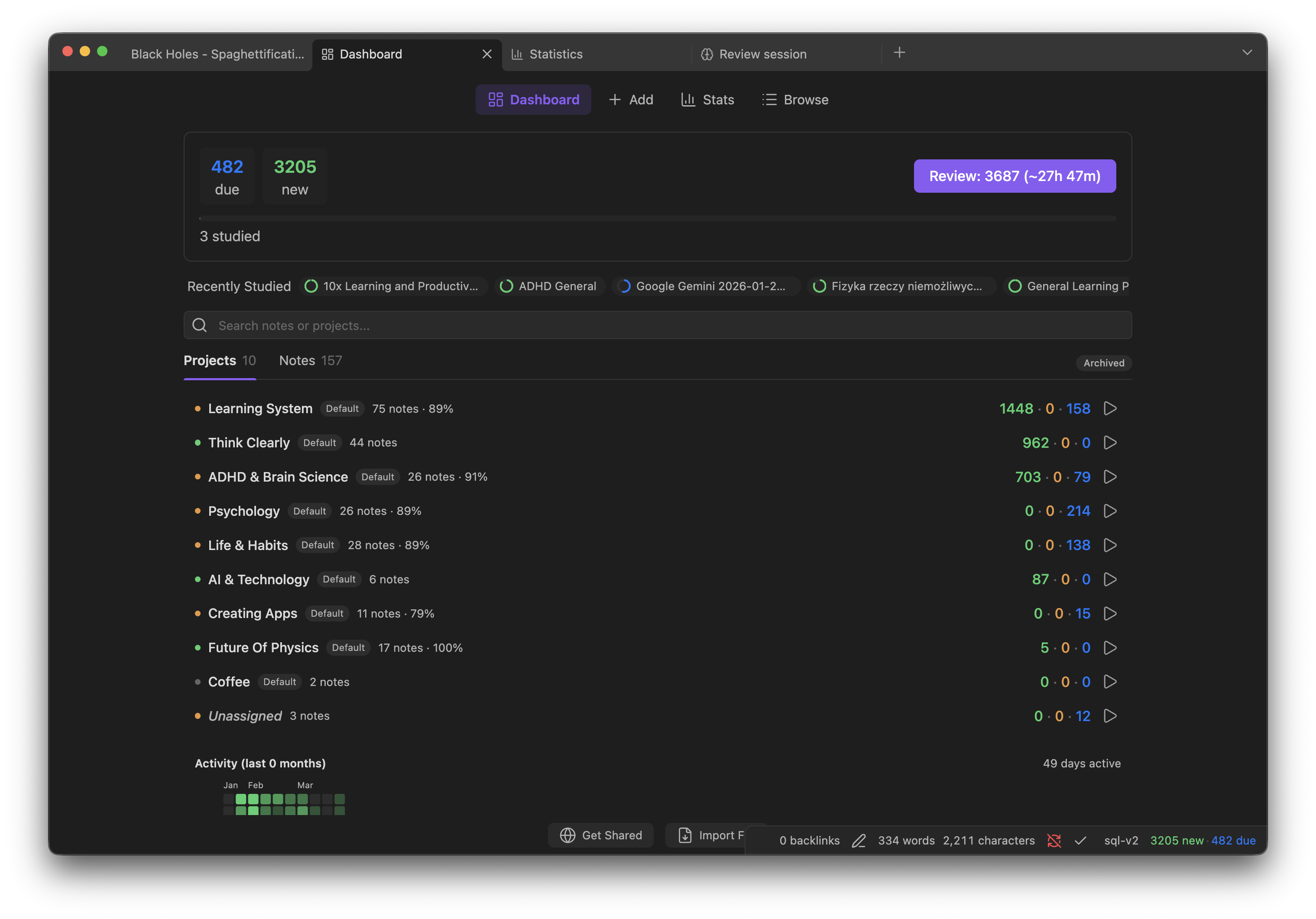 .apkgdecks and export to Anki or CSV/TSV. - Analytics & Widgets — Dashboard, statistics, calendar heatmap, forecast charts, and 25+ inline codeblock widgets you can embed in any note.