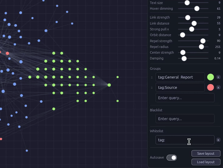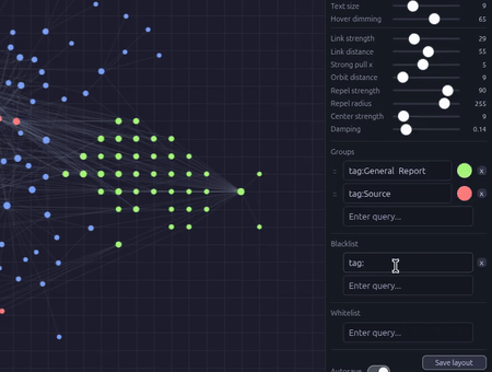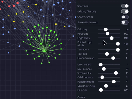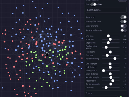 Advanced graph view with pin modes, orbit layout, strong pull, edge painting, and physics controls.