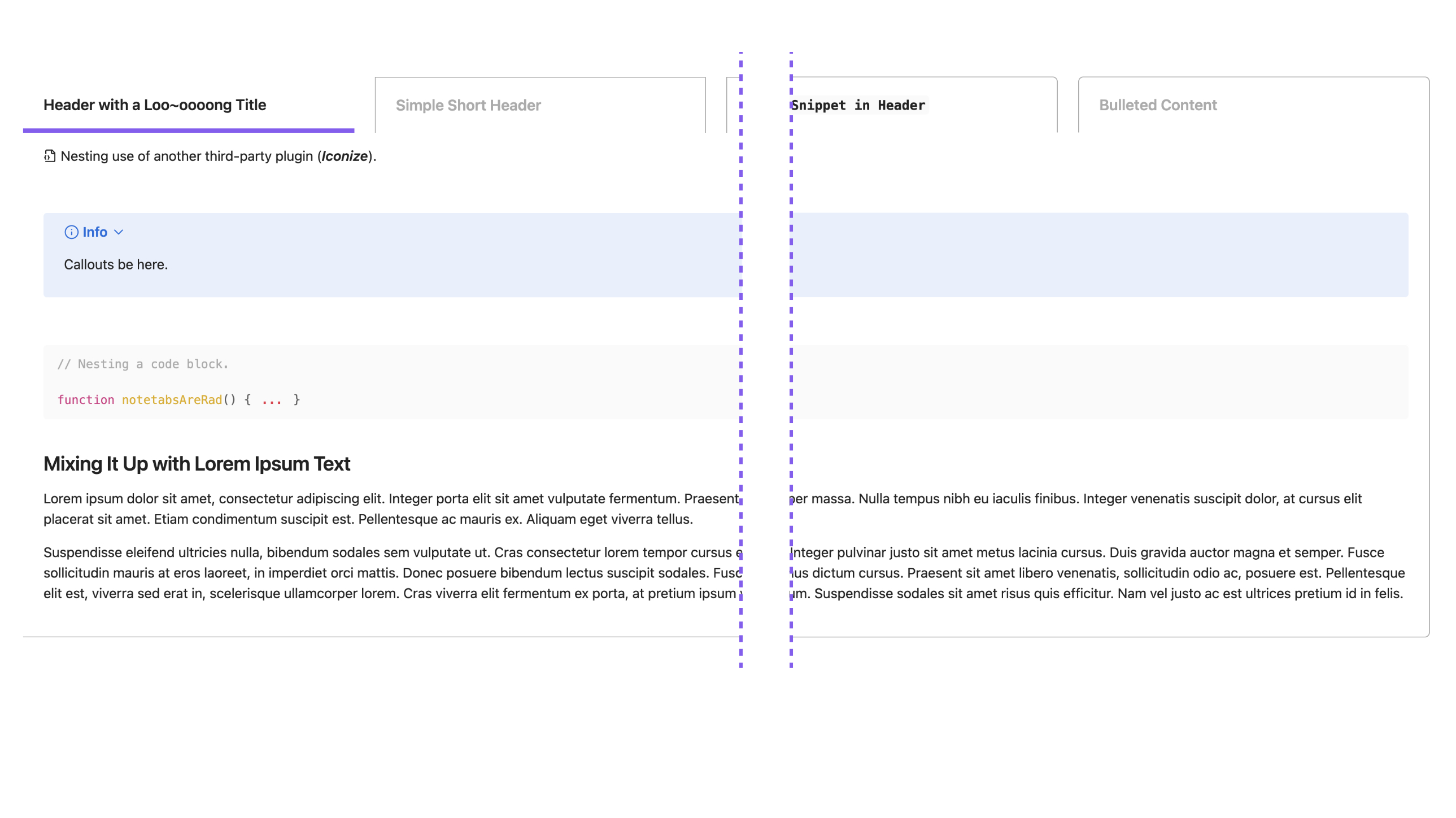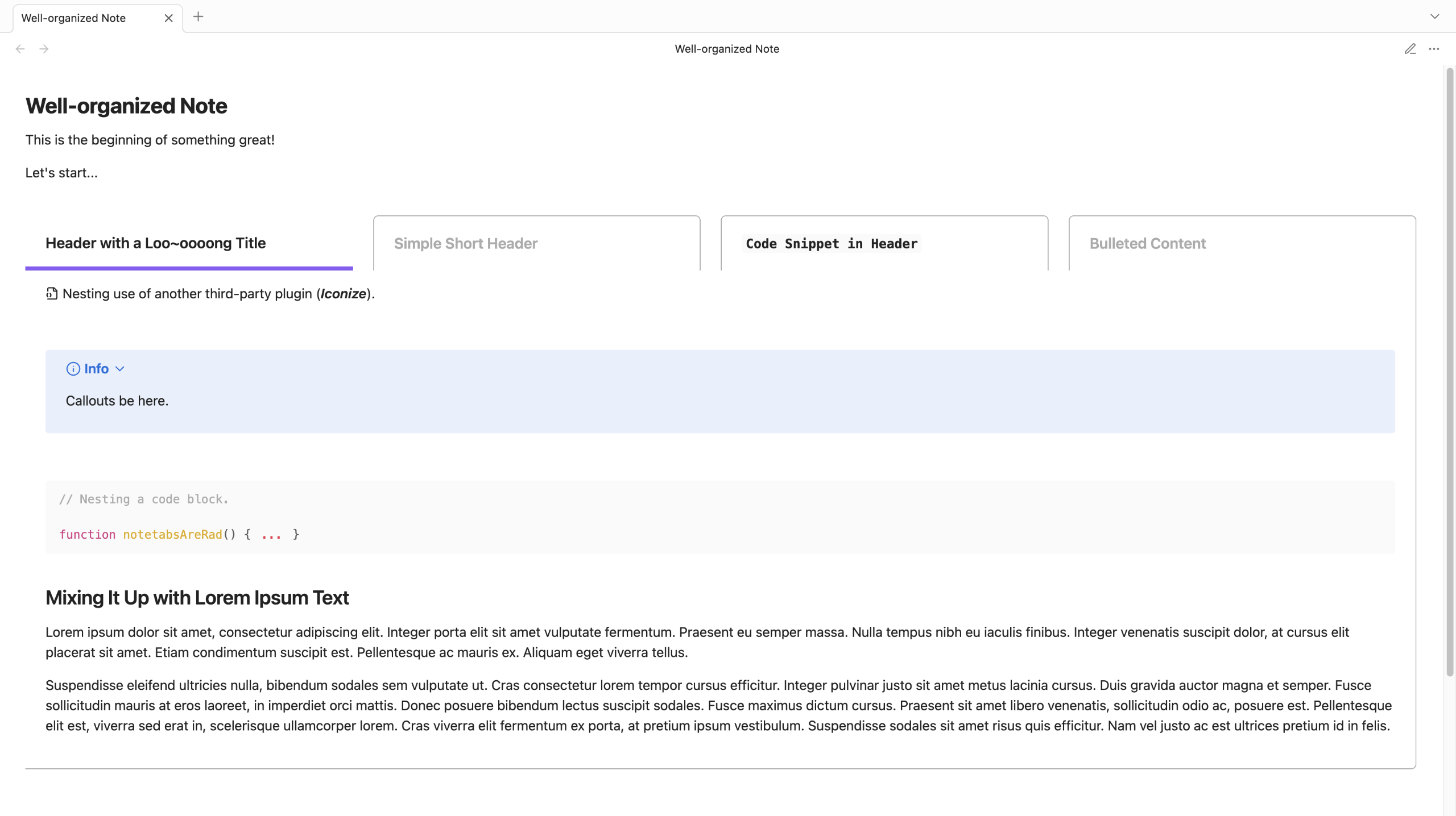 Elevate your Obsidian notes with tabbed sections. Note Tabs offers an intuitive way to organize your notes with a simple click. Note Tabs is highly responsive and compatible with most plugins and themes you choose to use with it.
