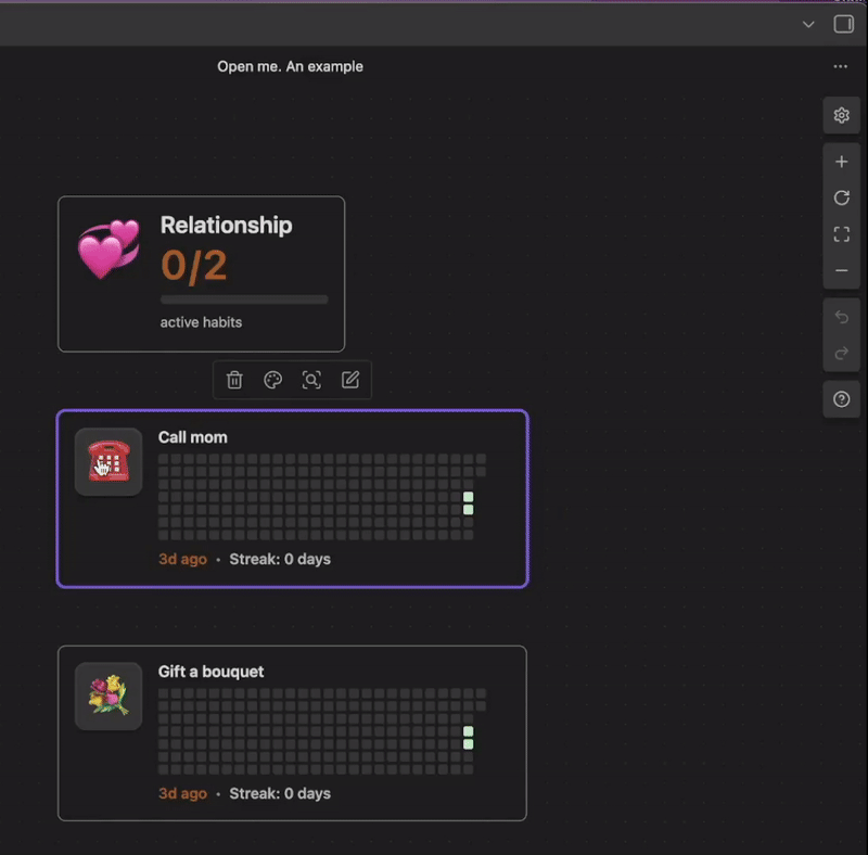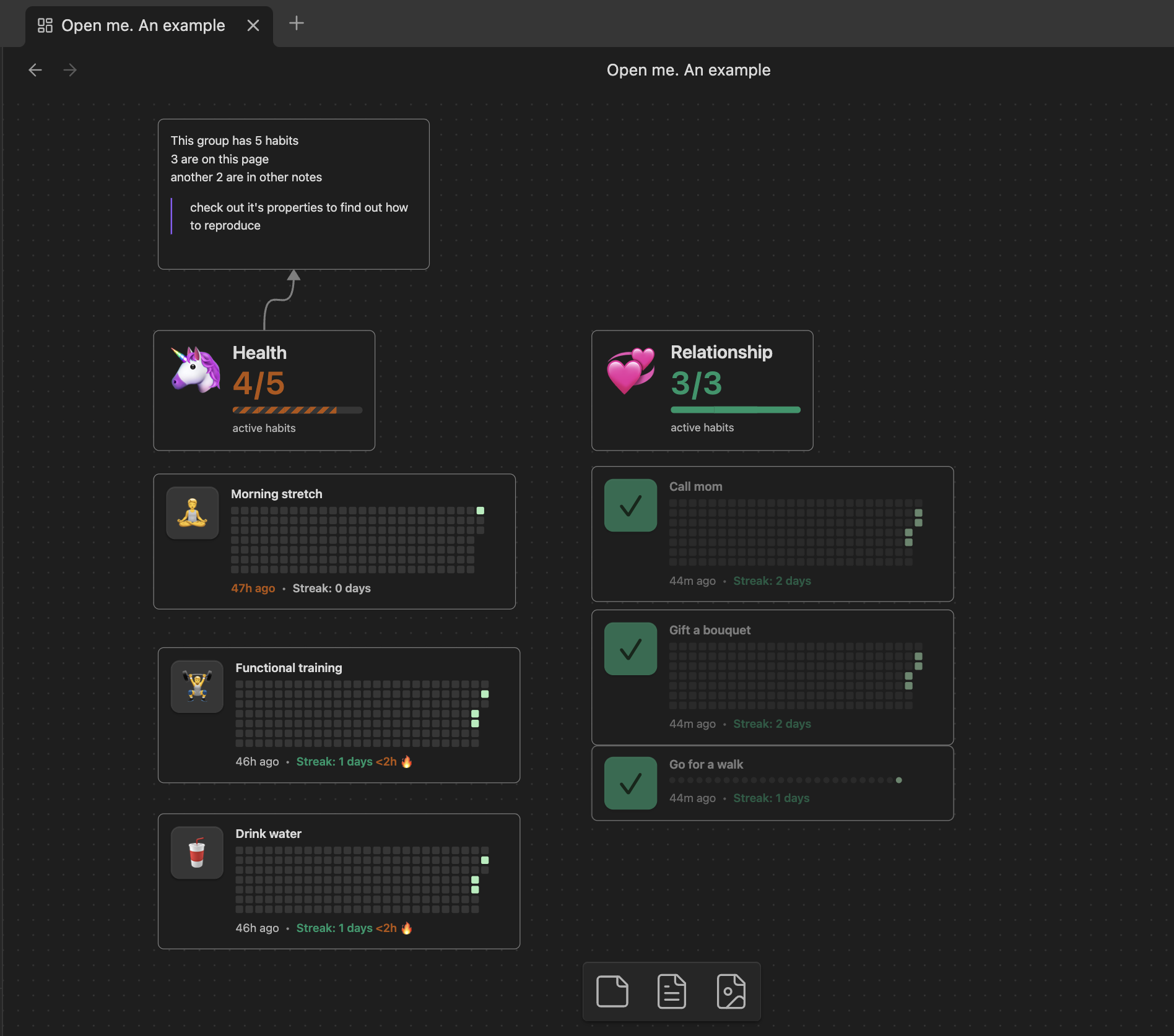 Drag the rendered blocks onto a Canvas or embed them via copy/paste. The plugin keeps stats in sync, so the Canvas view updates automatically when you mark a habit done elsewhere.