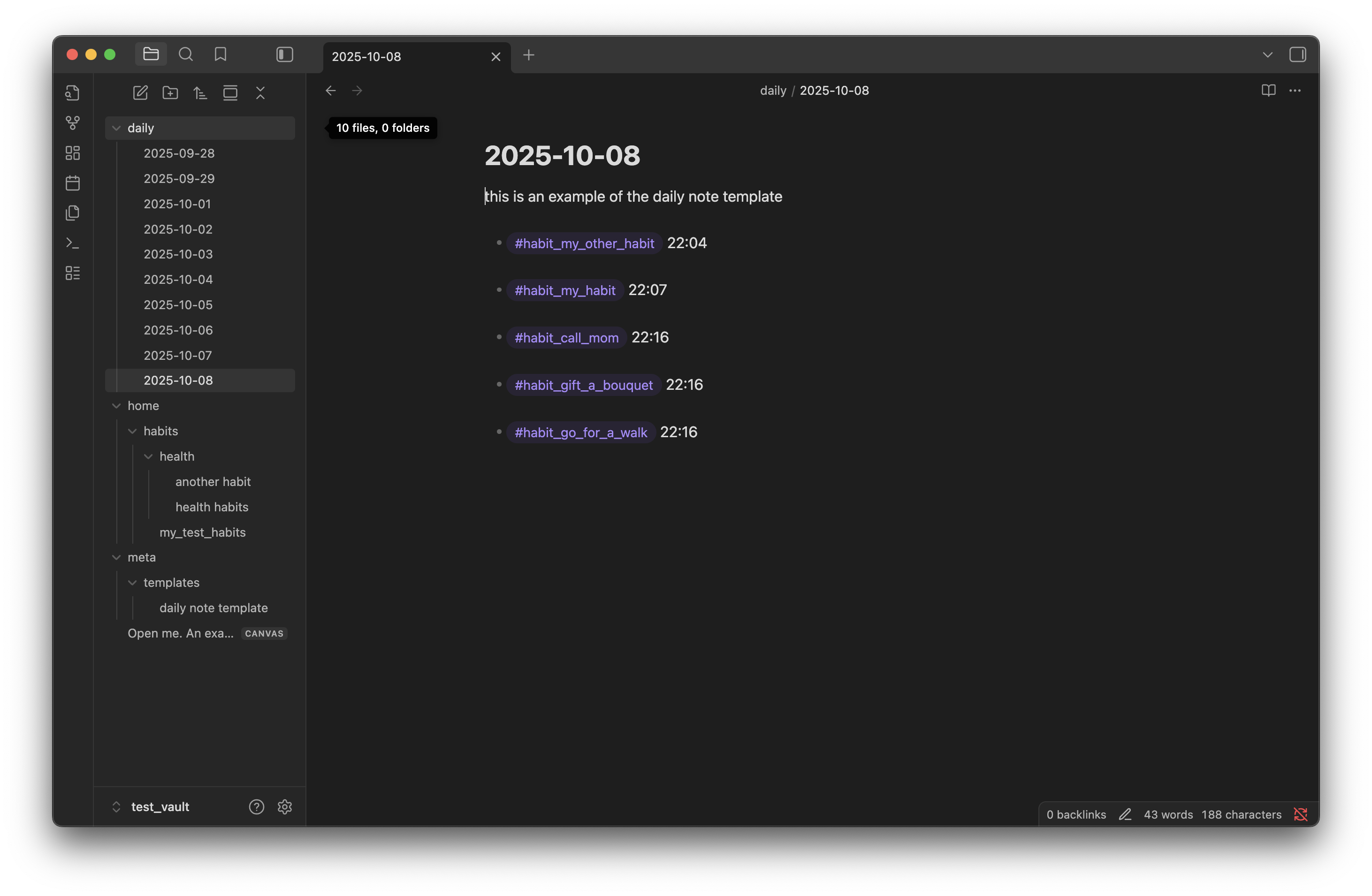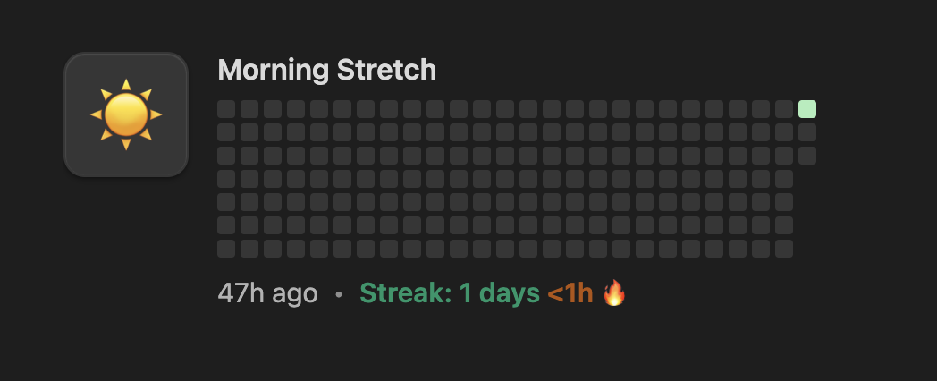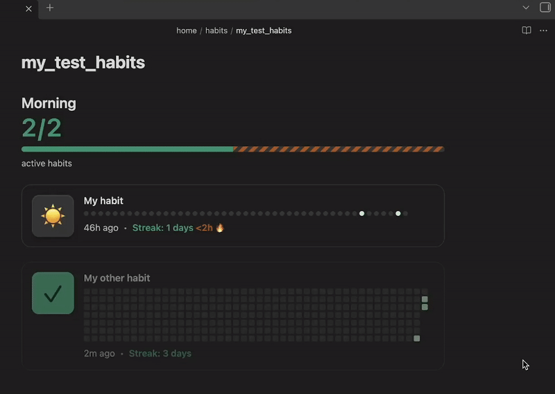 This plugin lets you track your habits in a single tap. Features like streaks and heatmaps will help you staying motivated, while grace and warning periods will allow you to stay flexible within your timeline.