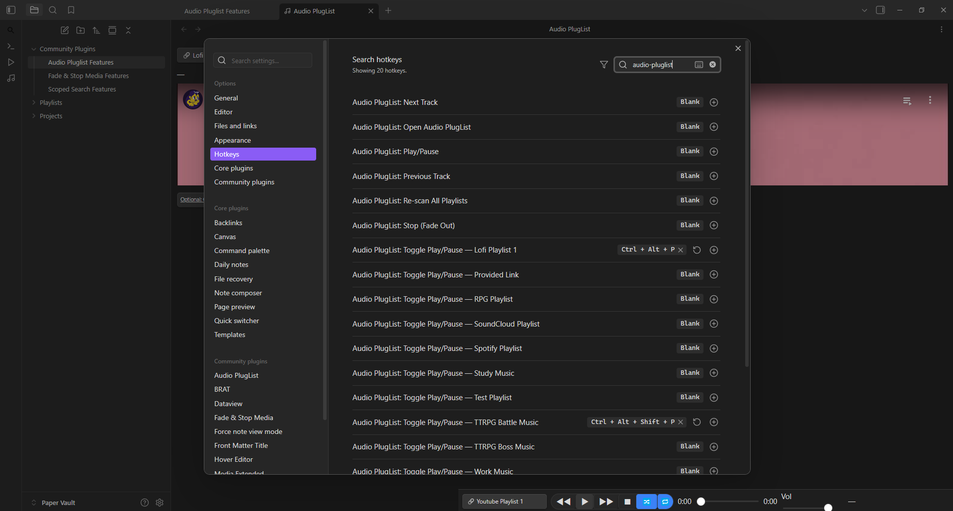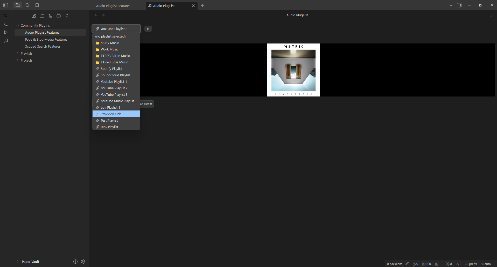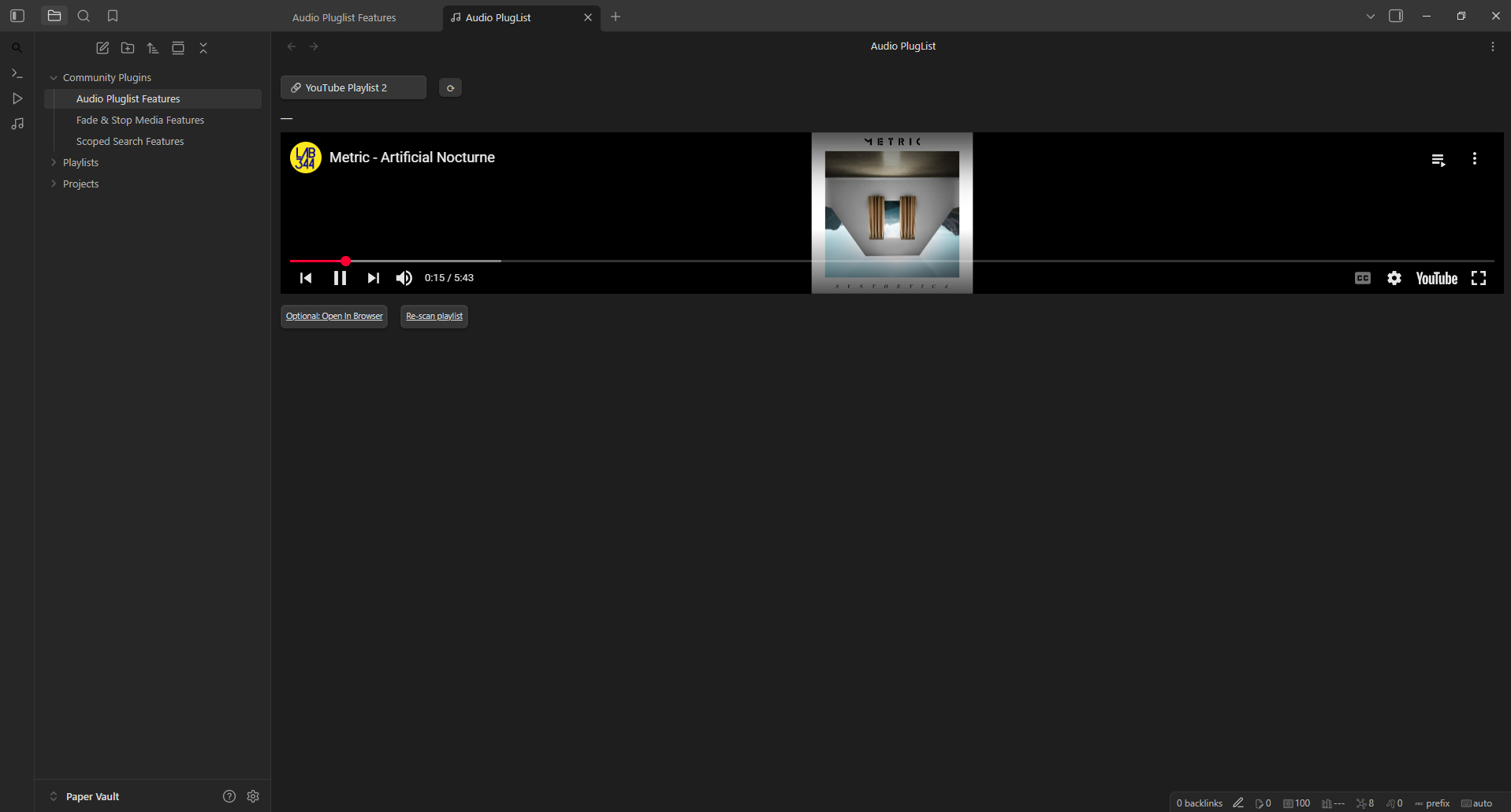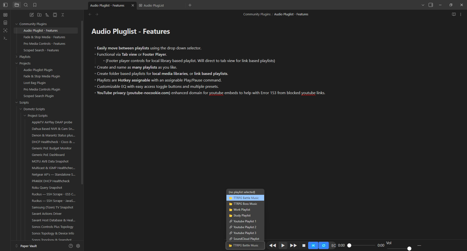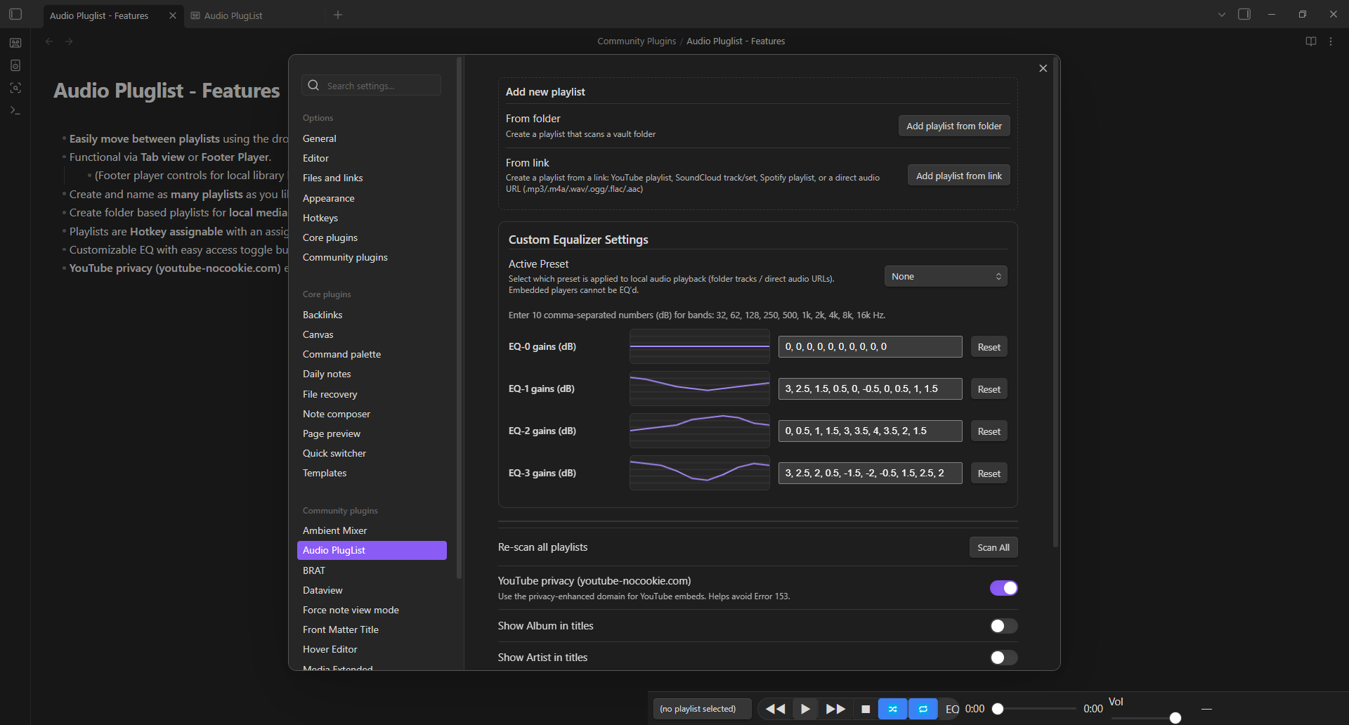 Playlist-based audio player for Obsidian. Point a playlist at a vault folder (auto-index audio files), an external link (with multi site support), then control playback from a clean tab view and a compact footer mini-player with shuffle/repeat, optional fade-out stop, EQ presets, and hotkey support.
