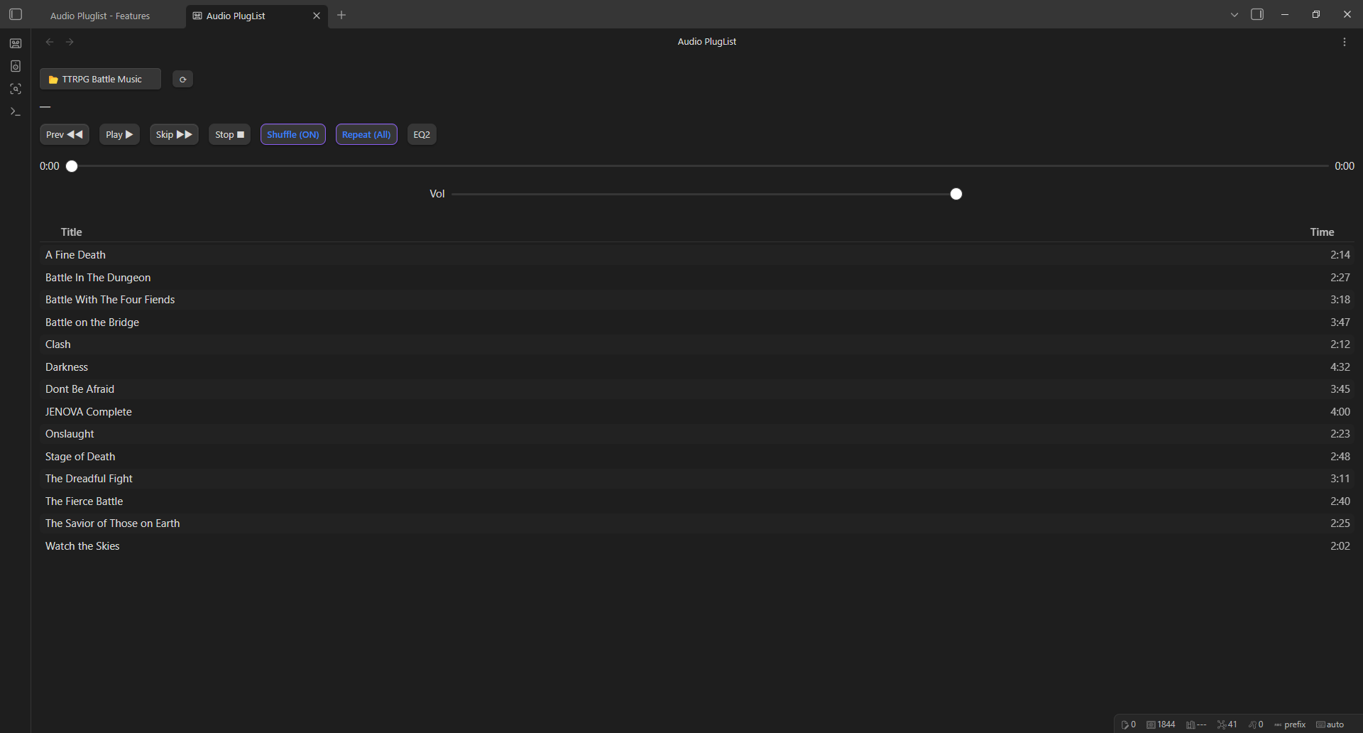 - Footer mini-player with segmented controls (⏮ ⏯ ⏭ ⏹ 🔀 🔁), seek, volume, and a marquee Now Playing title.