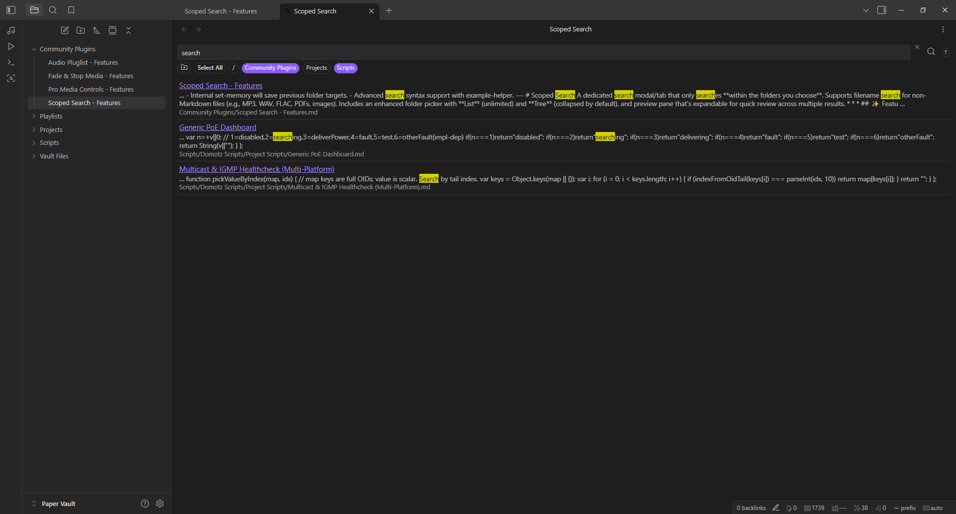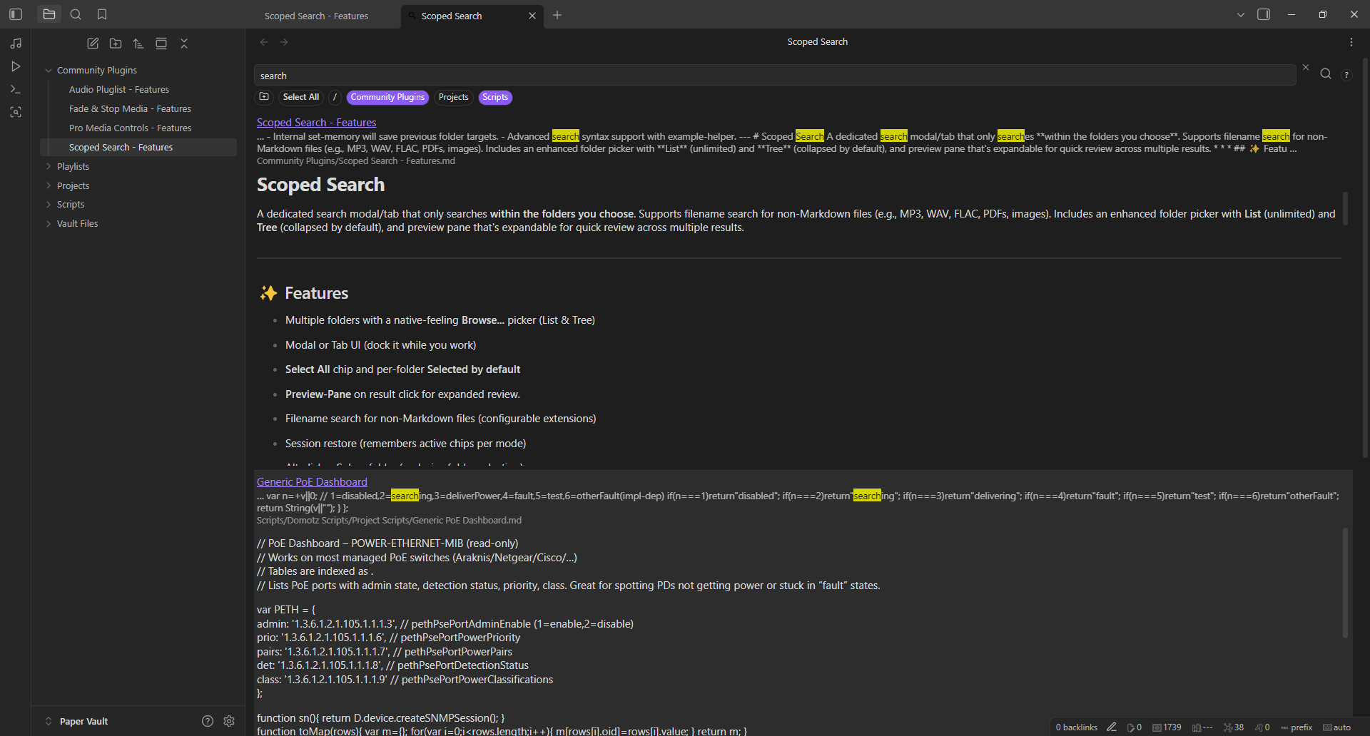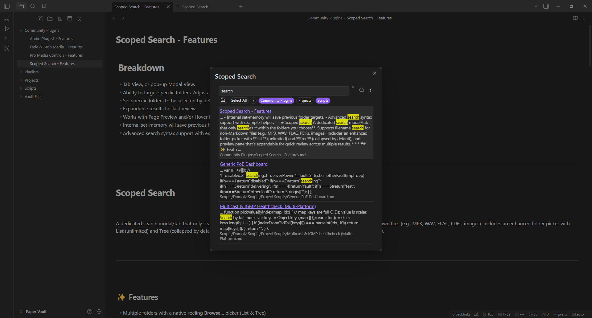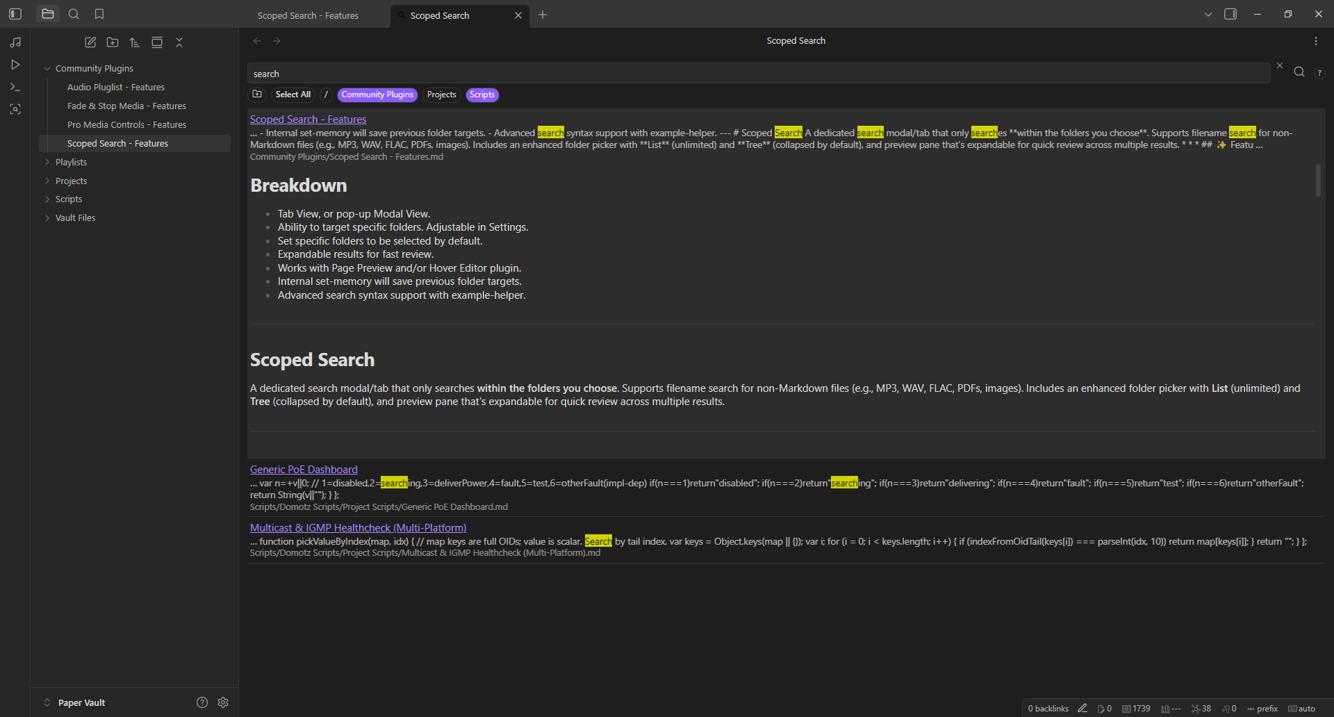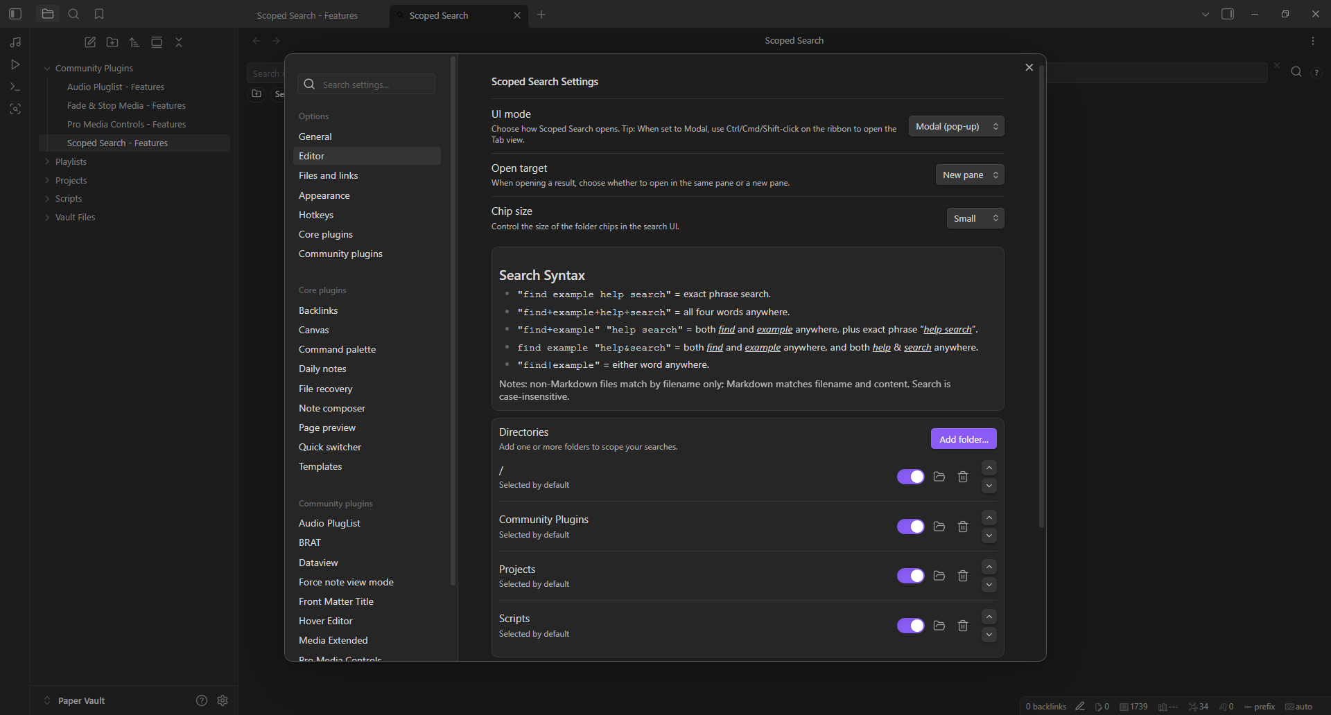 Scoped Search is a robust search modal/tab that only searches within the folders you choose. Includes enhanced folder picker by List or Tree, and configurable extensions.