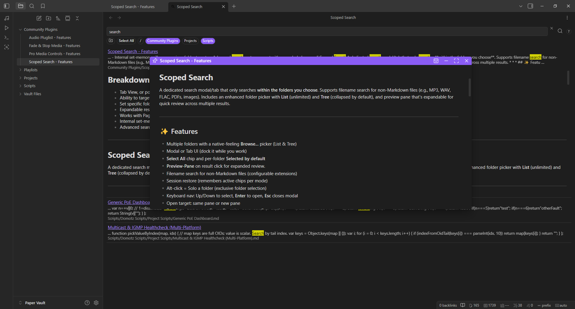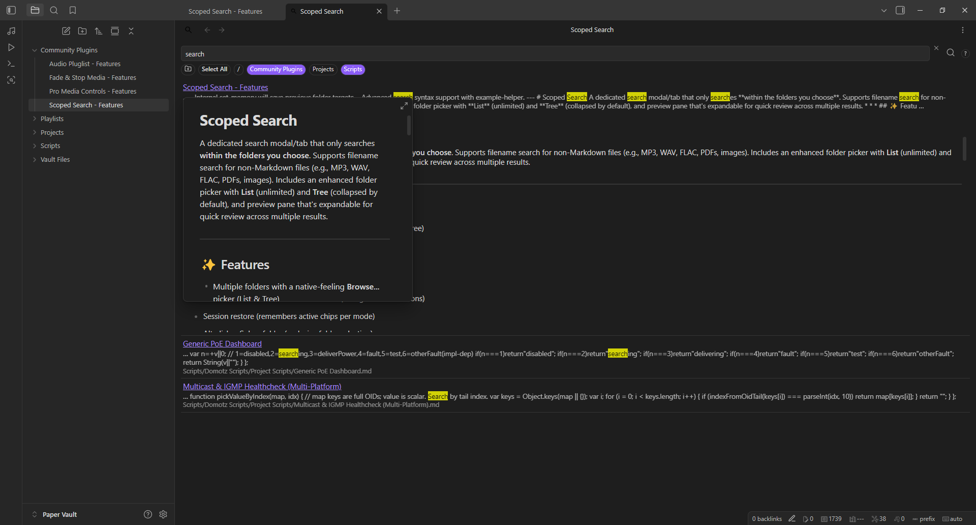 A dedicated search modal/tab that only searches within the folders you choose. Supports filename search for non-Markdown files (e.g., MP3, WAV, FLAC, PDFs, images). Includes an enhanced folder picker with List (unlimited) and Tree (collapsed by default), and preview pane that's expanable for quick review across multiple results.