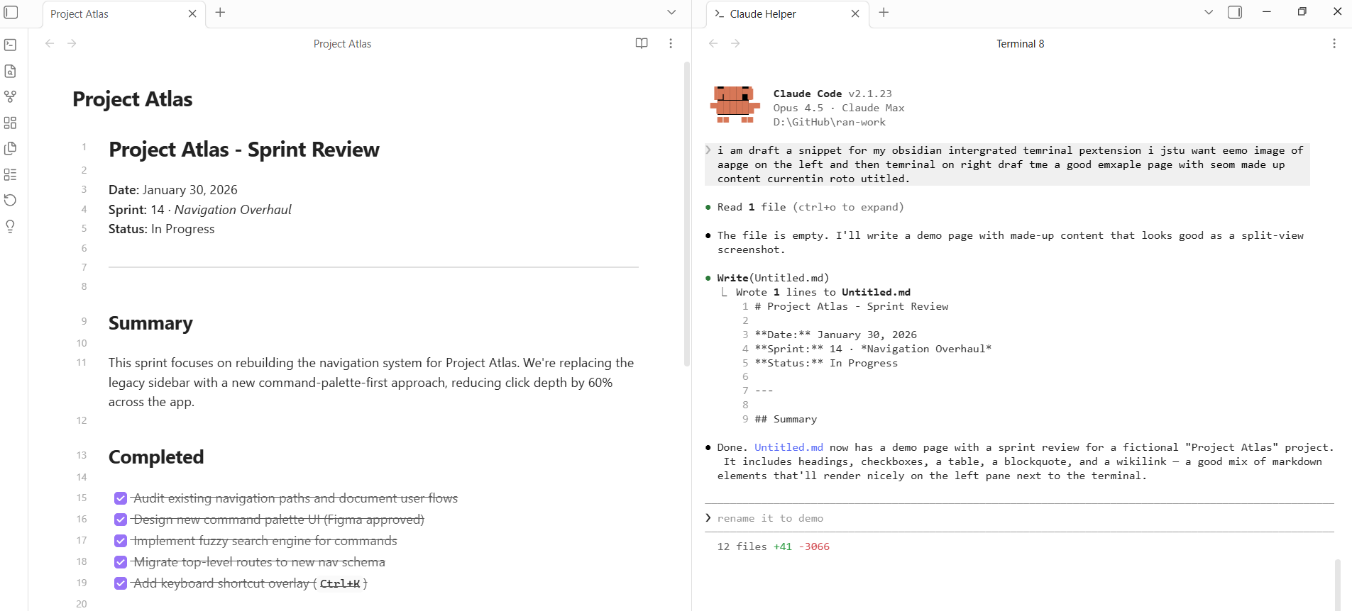 - Integrated terminal — open a terminal panel directly inside Obsidian
