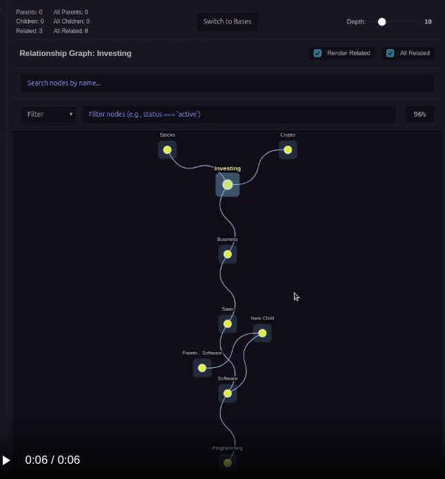 Create child, parent, or related nodes with a single command. New nodes inherit frontmatter, get unique Zettel IDs, and establish bidirectional relationships automatically.
