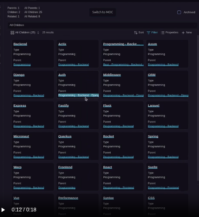 List-based relationship view with Cards, Table, and List display modes. Custom sorting with YAML formulas, archived filtering, and path-based inclusion rules.