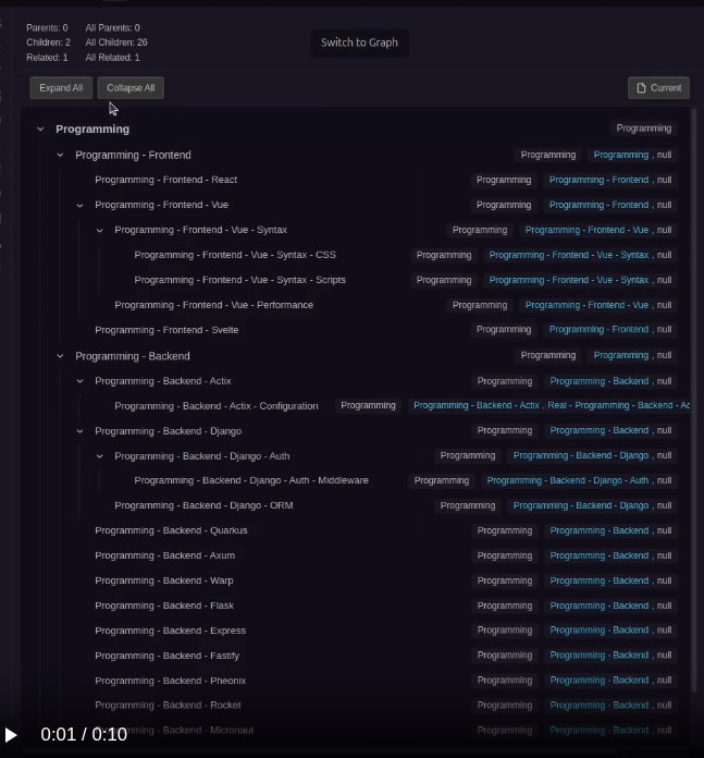 Collapsible tree outline with clickable wiki links. Toggle between current file or topmost parent as root. Supports bullet-list hierarchies as an alternative to frontmatter properties.
