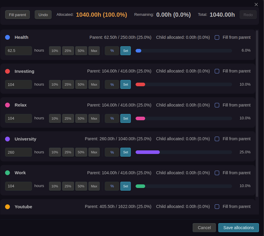 Define how many hours you have available and delegate them across categories (time investments), with budgets flowing down the hierarchy: