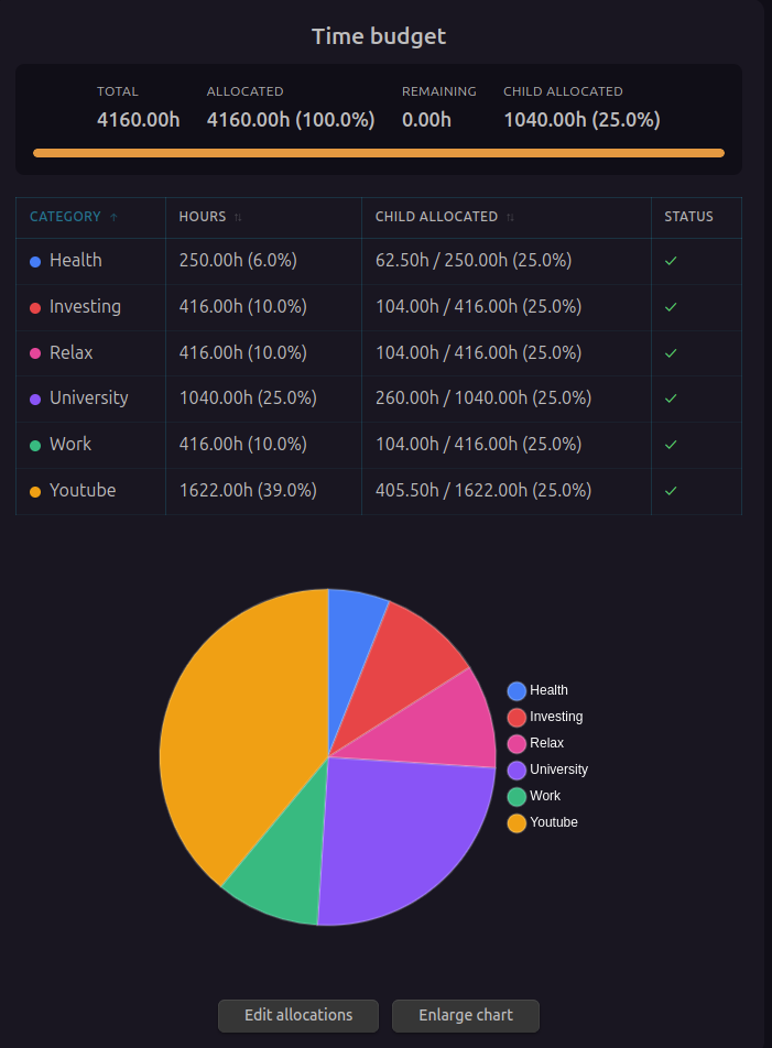 - You allocate hours into categories (work, learning, health, relationships, projects)