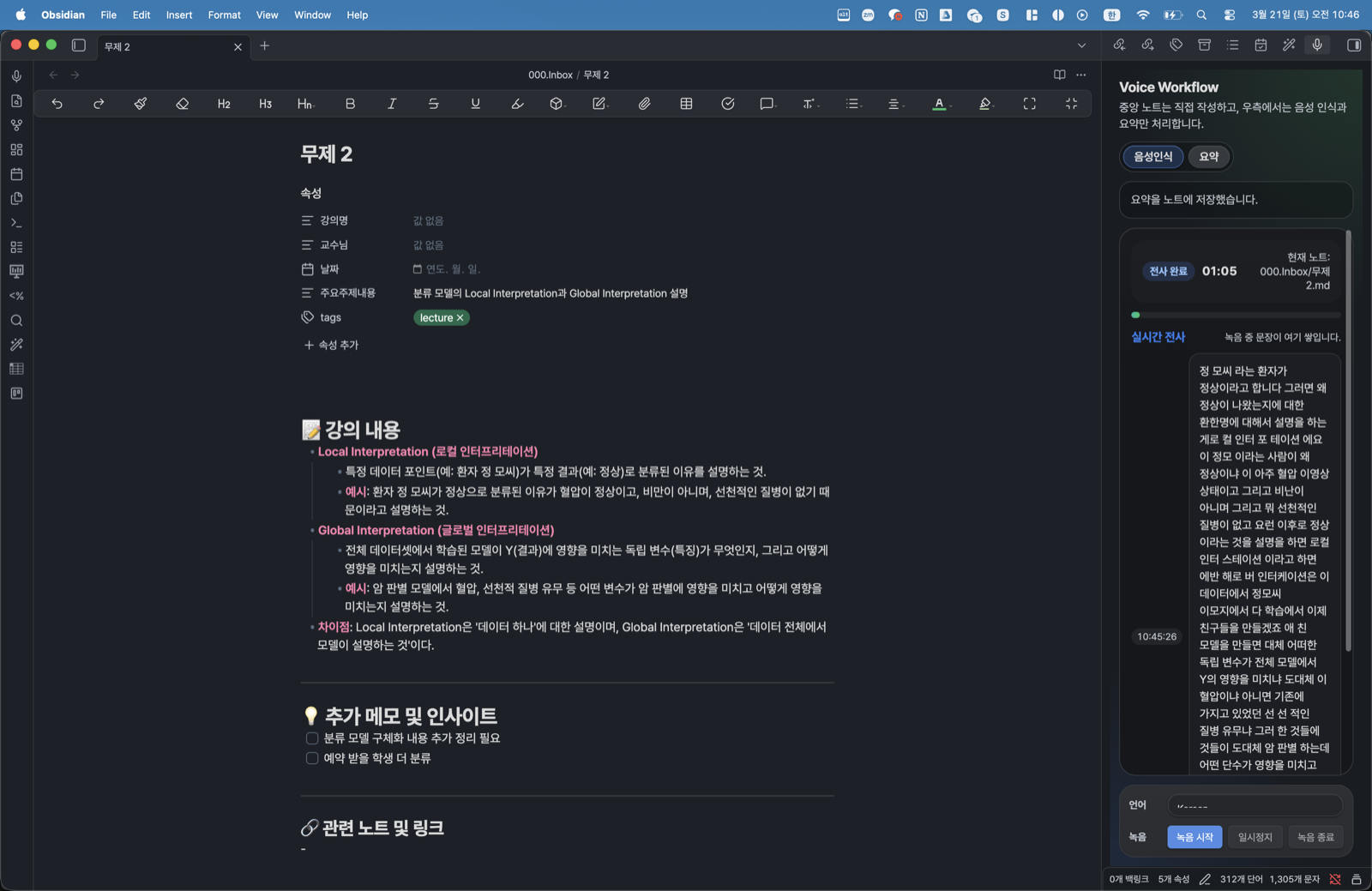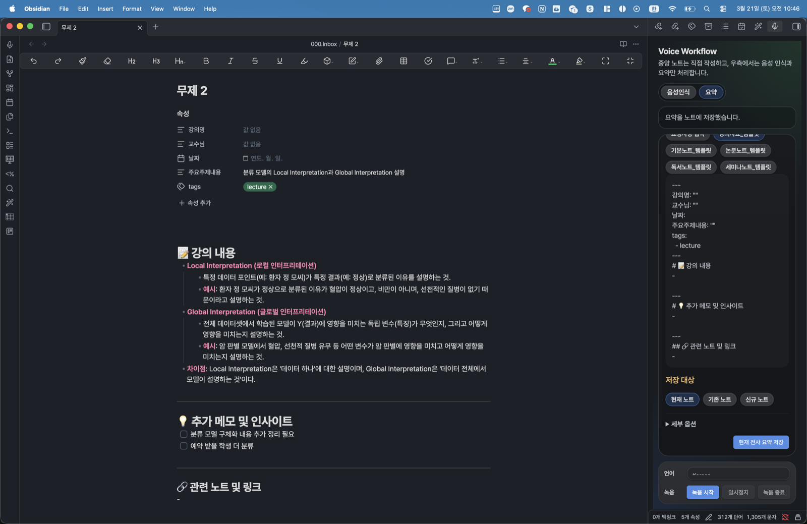 Obsidian 우측 사이드바에서 음성 녹음, 실시간 전사, 템플릿 기반 요약, 원문 보관을 처리하는 플러그인입니다.