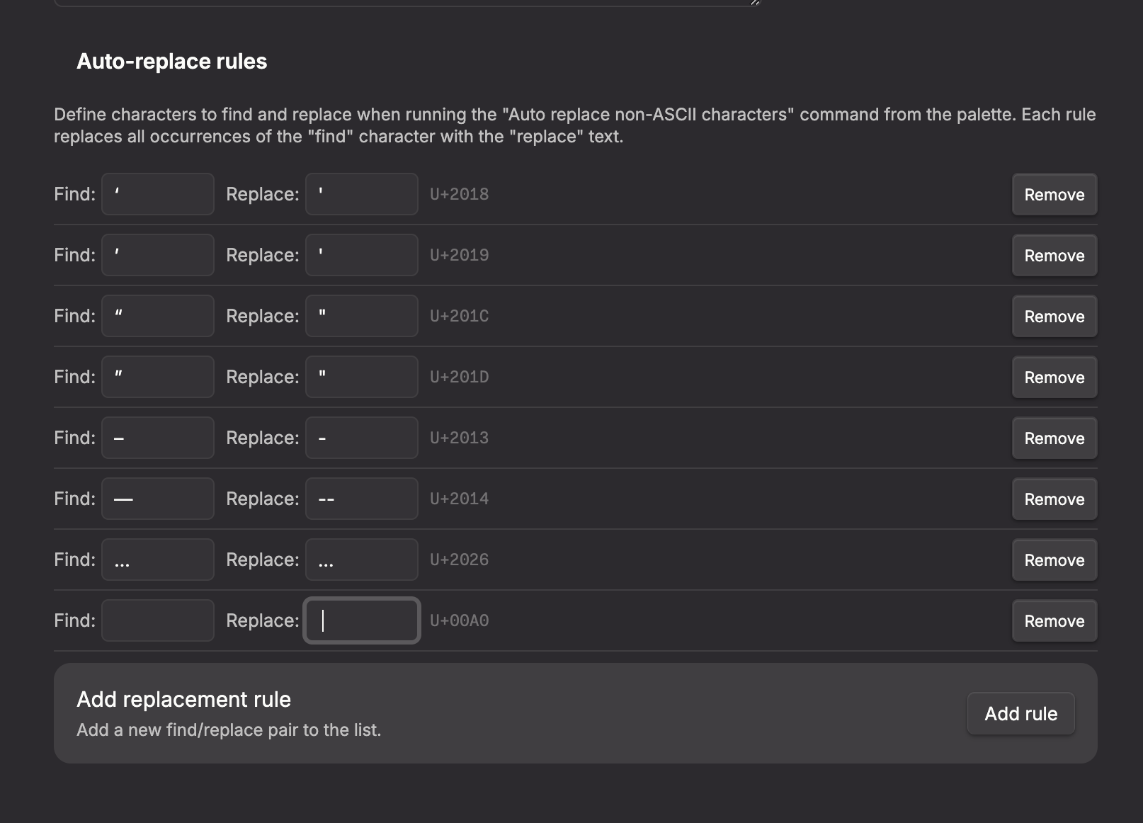 You can add, edit, or remove replacement rules in Settings > Highlight Non-ASCII under the Auto-replace rules section. Each rule shows: