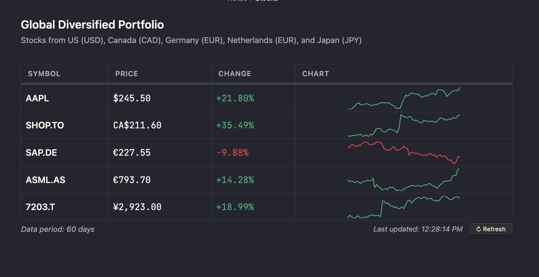 stocks,symbols, ortickers: Comma-separated list of stock symbols (any of these property names work)days: Number of days of historical data (default: 30, interpreted as business days if enabled in settings)width: Width of sparklines in pixels (default: 500, capped at 120 for table display)height: Height of sparklines in pixels (default: 300, capped at 40 for table display)linkStyle: How to display symbols -none,wikilink, ormarkdown(default: none)sparkline: Whether to show sparkline charts in the table (default: true)showTodayChange: Show today's change as separate column when days >= 2 (default: false)refreshInterval: Auto-refresh interval in minutes (optional)title: Custom title text (optional, defaults to "Stock List")description: Descriptive text shown below the title (optional)