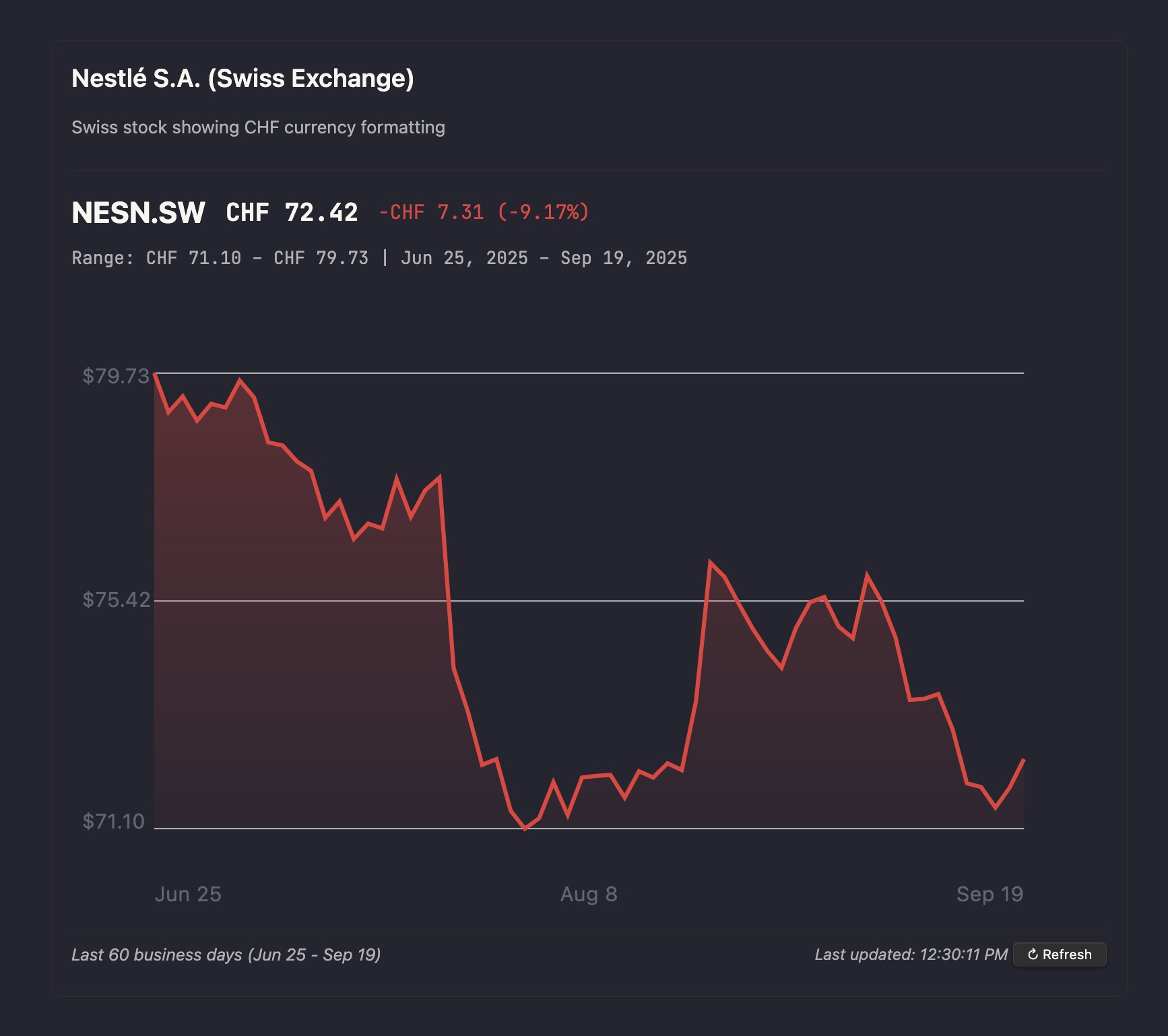 symbol,symbols,stock,stocks,ticker, ortickers: Stock symbol to display (any of these property names work)useCandles: Display as candlestick chart instead of line chart (default: false)days: Number of days of historical data (default: 30, interpreted as business days if enabled in settings)width: Width of chart in pixels (default: 500)height: Height of chart in pixels (default: 300)showAxes: Show price and date axes (default: true)refreshInterval: Auto-refresh interval in minutes (optional)showLastUpdate: Show last update timestamp and refresh controls (default: true)showTodayChange: Show today's change alongside period change when days >= 2 (default: false)title: Custom title text (optional, shows above the stock symbol and price)description: Descriptive text shown below the title (optional)