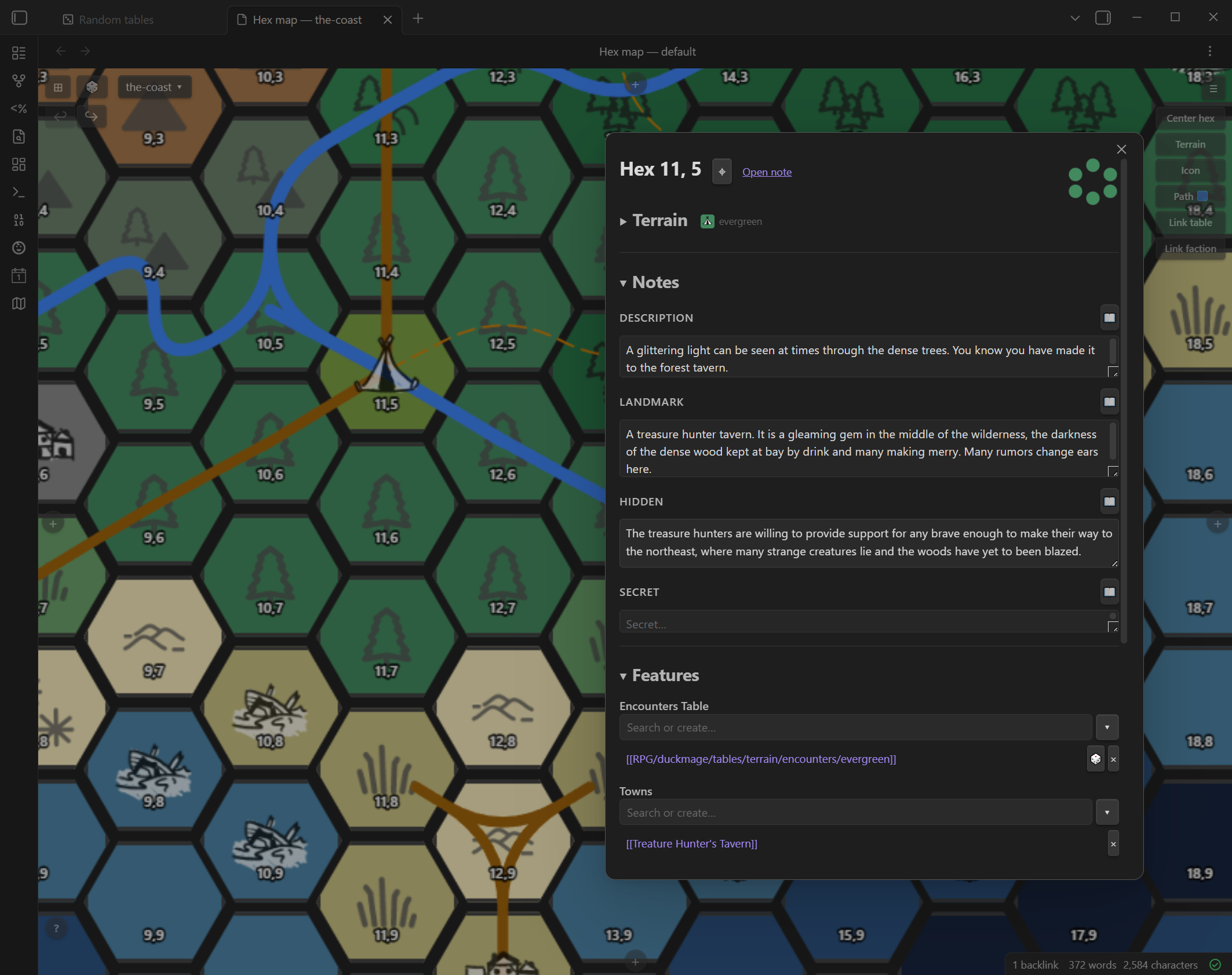 - Encounters Table — link random table files to a hex. Clicking a linked table opens the Random Tables view with that table pre-selected.
