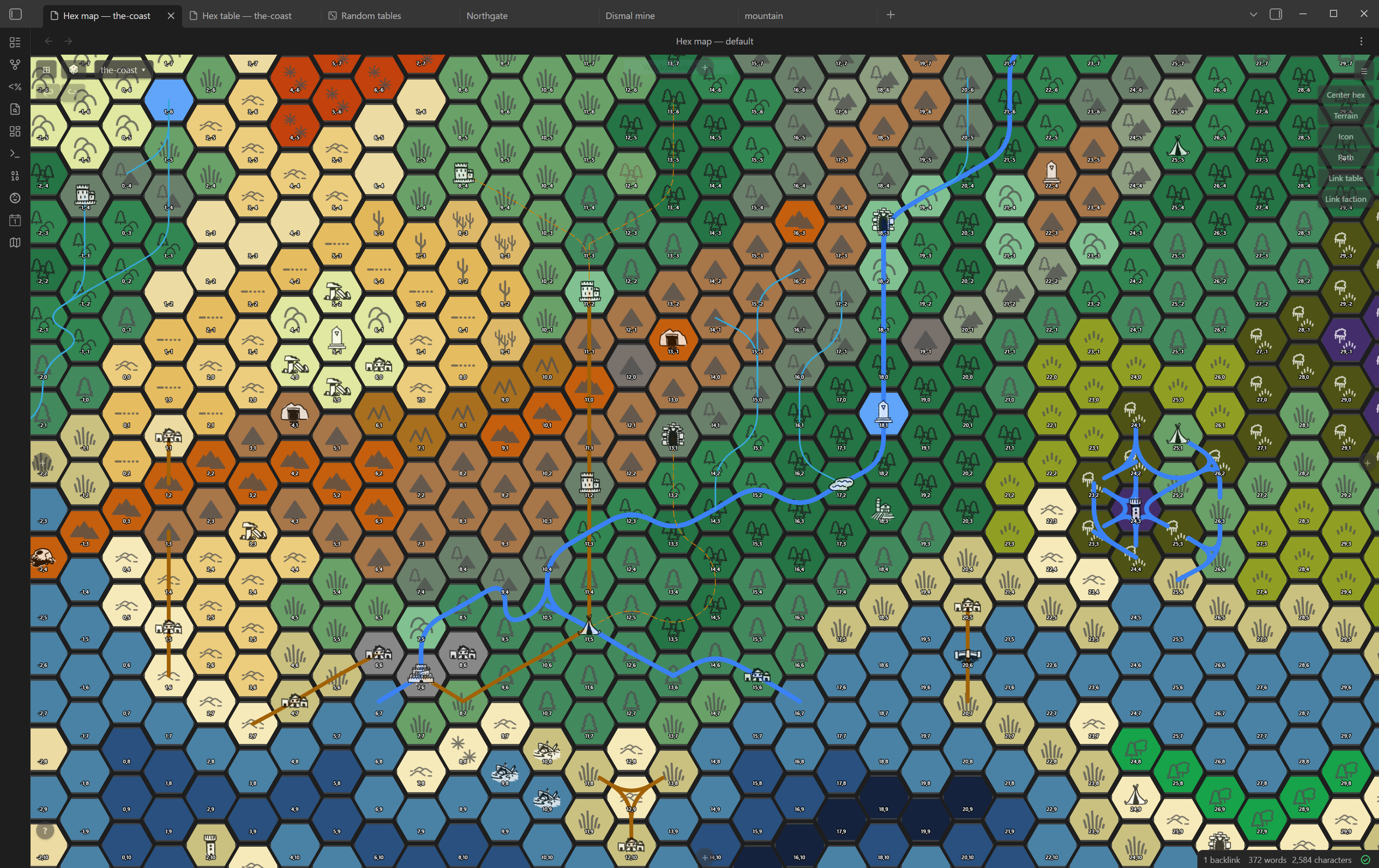 An Obsidian plugin for tabletop RPG hex-map world-building. Each hex on the map is a Markdown note in your vault — attach terrain, locations, paths, and prose directly to the geography of your world.