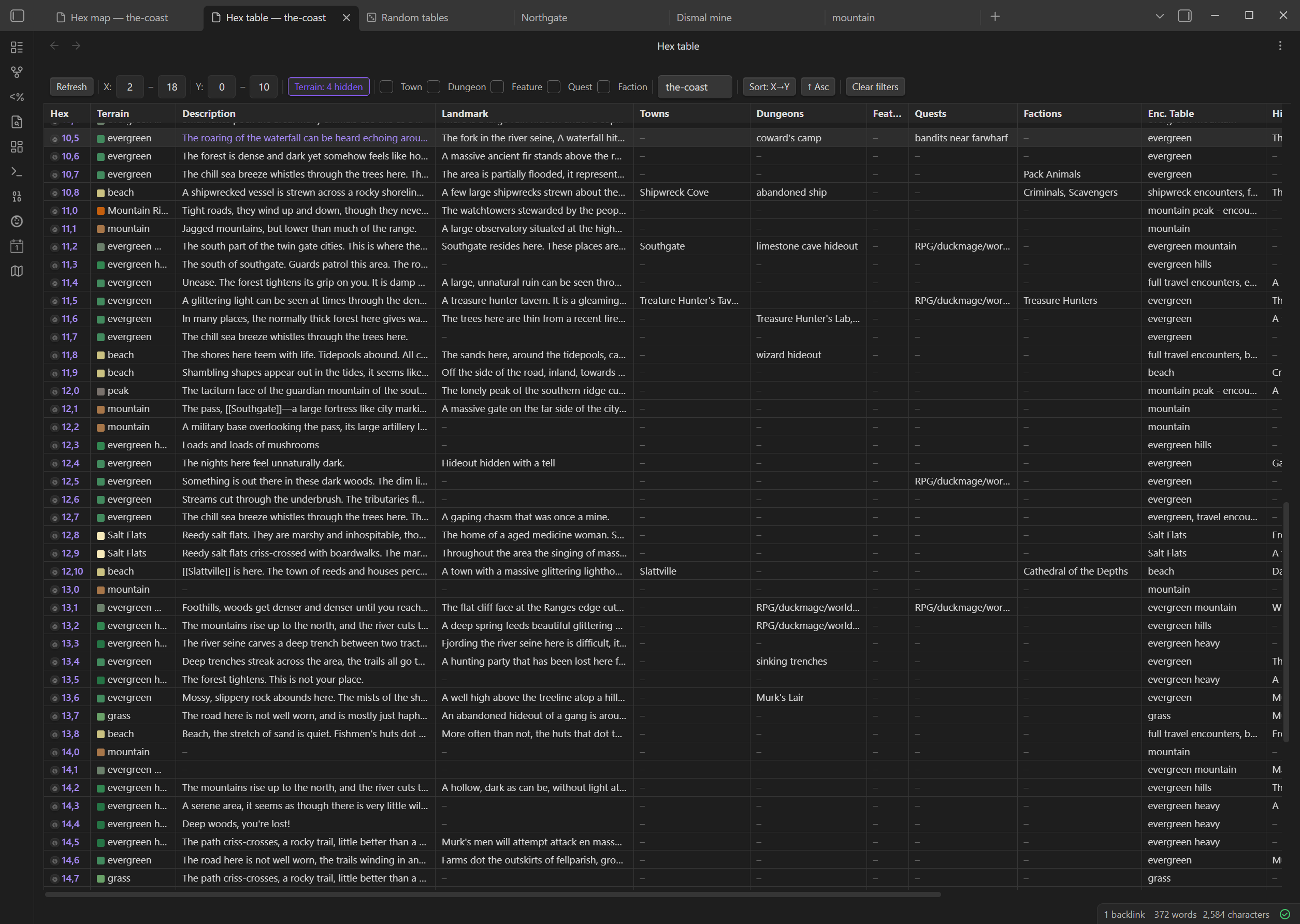 A scrollable spreadsheet of every hex note — one row per hex, columns for terrain, description, towns, dungeons, features, quests, factions, encounters table, and all the freeform sections. Click any cell to edit it in place. Filter by region, terrain type, or the presence of specific link types. The ◎ button jumps the map view to that hex's position.