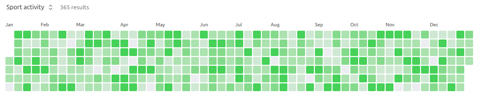 GitHub-contributions-style heatmap for any date-based property in your Bases tables. Track activity, habits, and progress with color-coded squares.