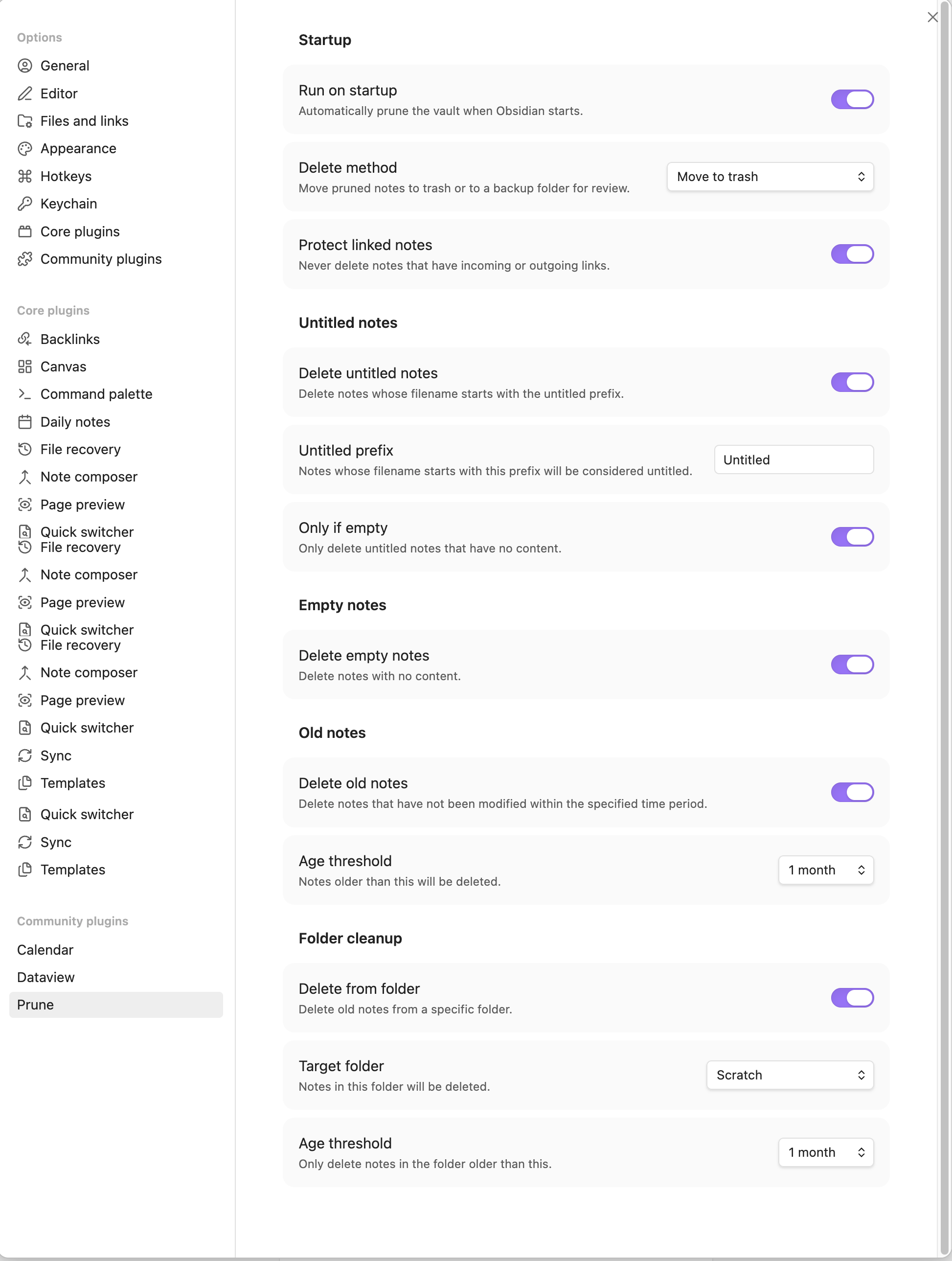 prune-backupfolder in your vault root for review, instead of sending them straight to trash. - 🚀 Run on startup — Optionally prune automatically when Obsidian launches.