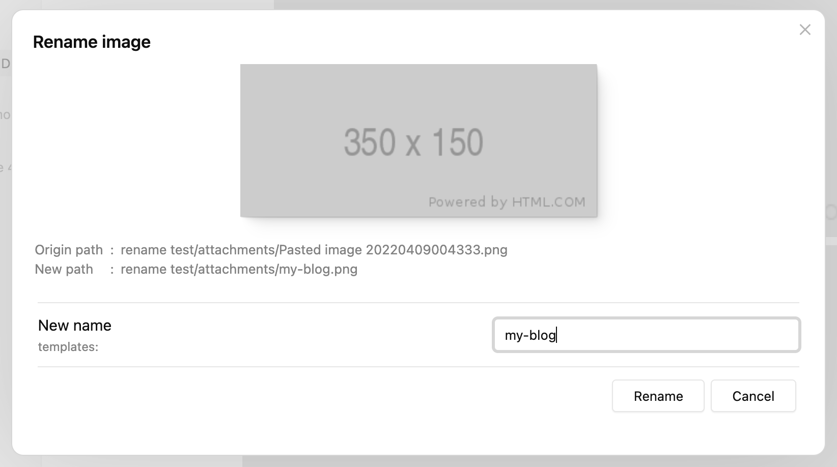 Let's continue from the last section and paste the second image, the prompt will still show the new name as "my-blog", now if we just click "Rename", the file will be renamed as "my-blog-1.png", not "my-blog.png":