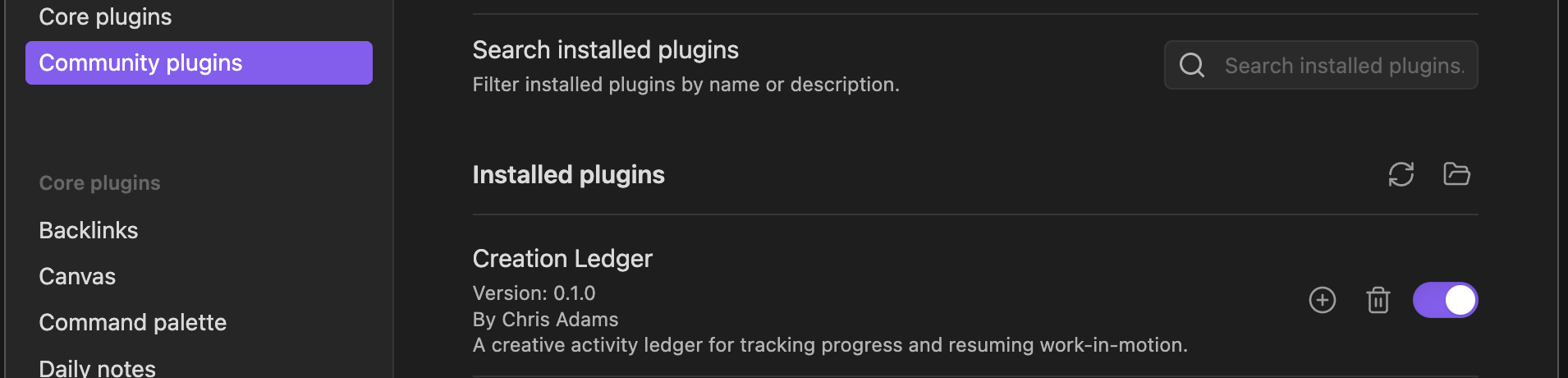 - Download the plugin ZIP from GitHub: https://github.com/torusheadstudios/obsidian-creation-ledger