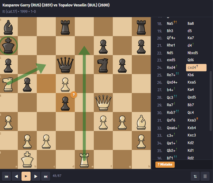 Qxd4+ Kxa5 27. b4+ $1 Ka4 28. Qc3 $3 Qxd5 29. Ra7 $1 Bb7 30. Rxb7 $3 Qc4 31. Qxf6