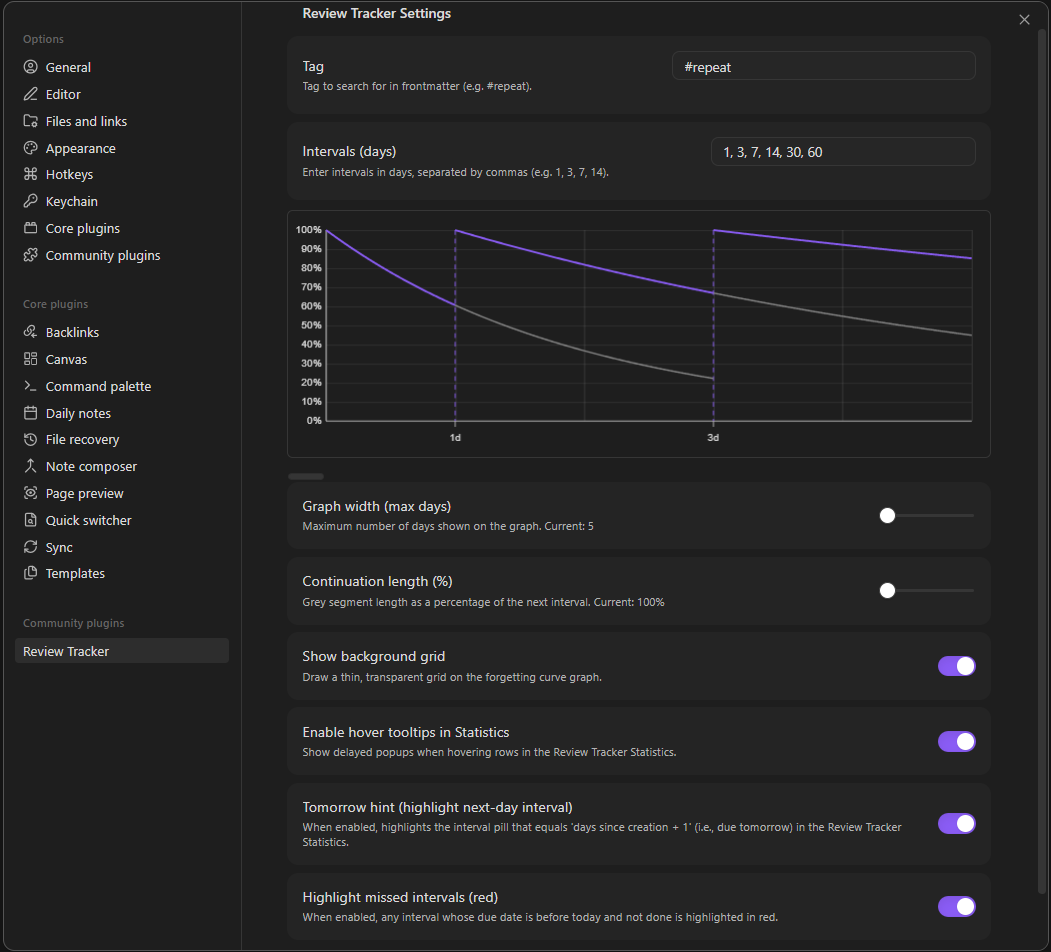 Review Tracker includes a settings panel that allows users to control how notes are selected for review and how review intervals are displayed.