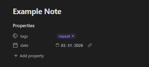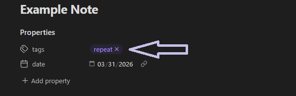 For example, if this field is set to #repeat, the plugin will work with notes whose properties / frontmatter contains this tag. This makes it possible to separate ordinary notes from the notes you want to include in your review workflow.