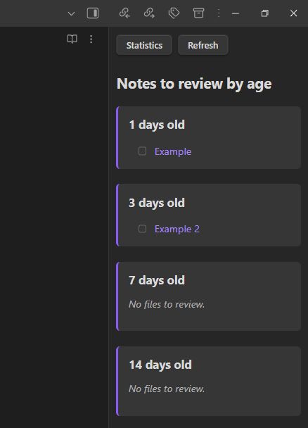 - 1 day old — this section shows notes for which the first review interval has been reached, meaning they should be reviewed 1 day after the starting date