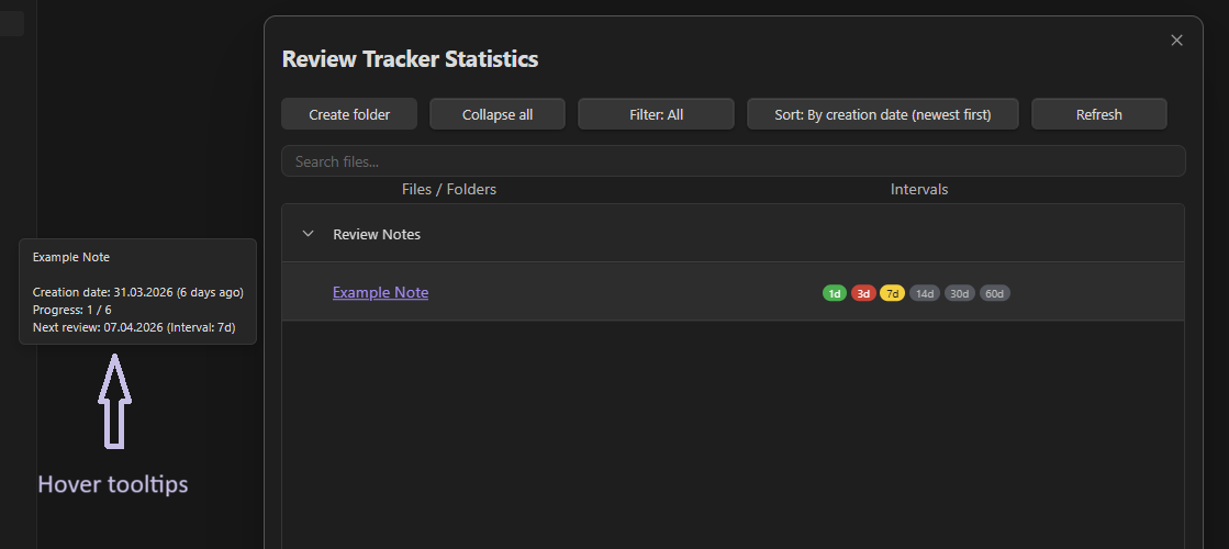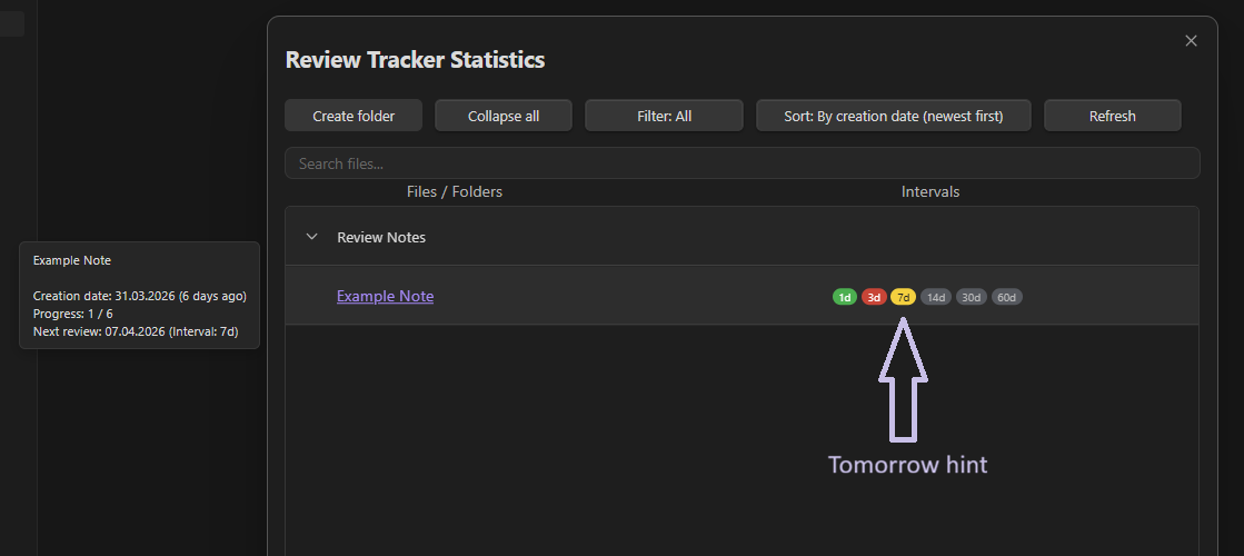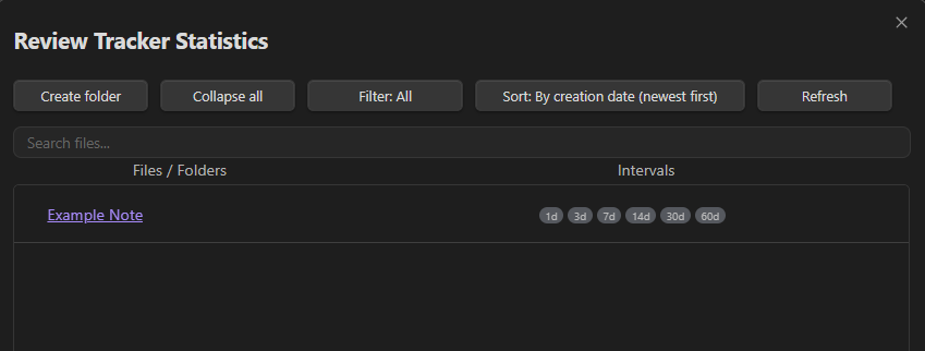 Review Tracker is an Obsidian plugin designed to organize note review using predefined time intervals. Its main function is to help users see which notes should be reviewed, when they should return to them, and which review intervals have already been completed.